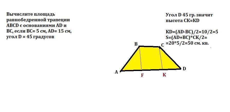Вычислите площадь равнобедренной трапеции ABCD с основаниями AD и BC, если BC= 5 см, AD= 15 см, угол D = 45 градусов