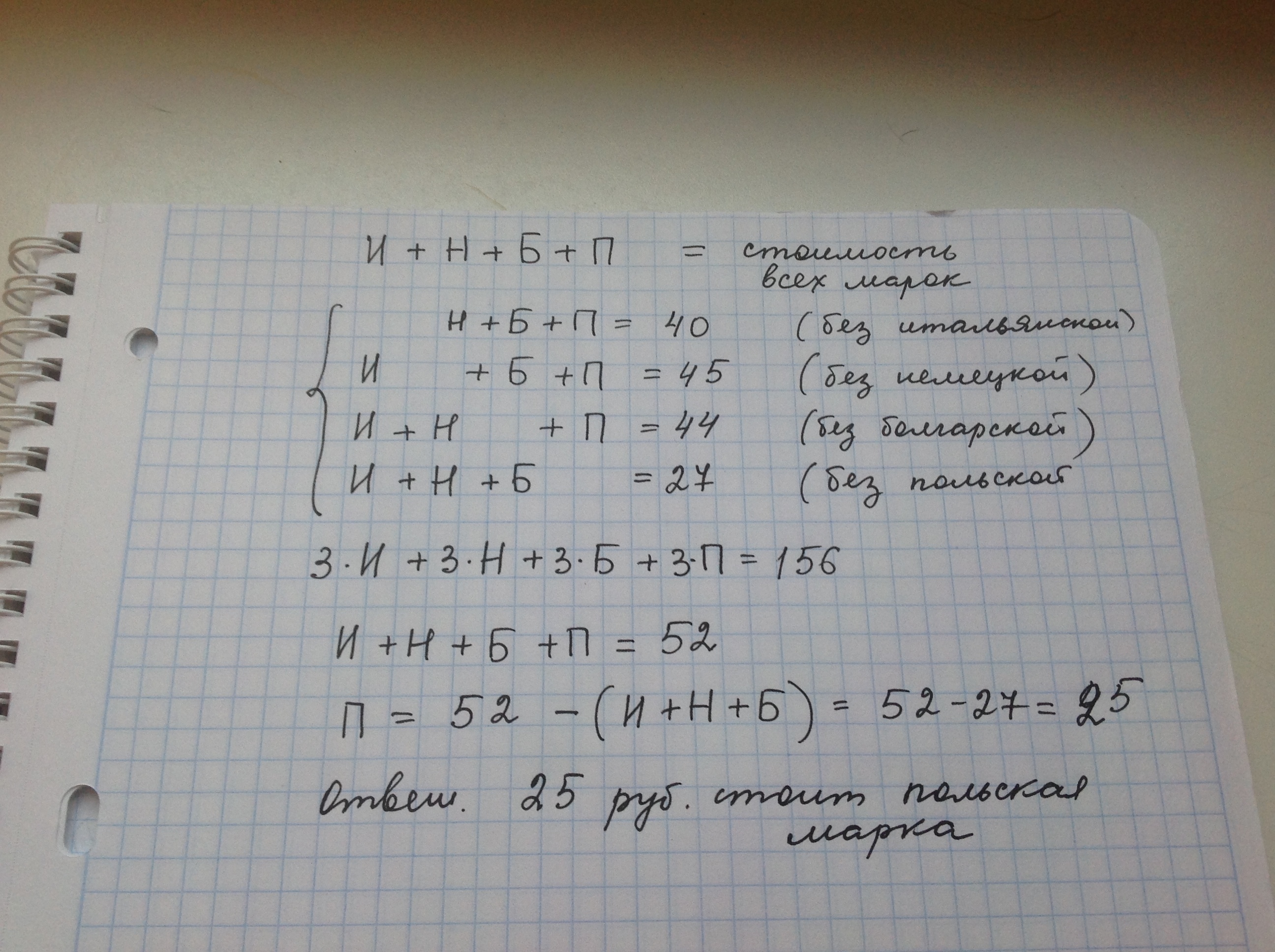 Дед Мороз купил для коллекции 4 марки - итальянскую, немецкую, болгарскую и польскую. Стоимость покупки без итальянской марки – 40 рублей, без немецкой марки - 45 рублей, без болгарской -44 рубля и без польской 27 рублей. Сколько стоит польская марка