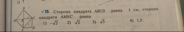 АС=√АД²+СД²=√1²+1²=√2 см и это значит ,что сторона квадрата AMNC равна √2 см