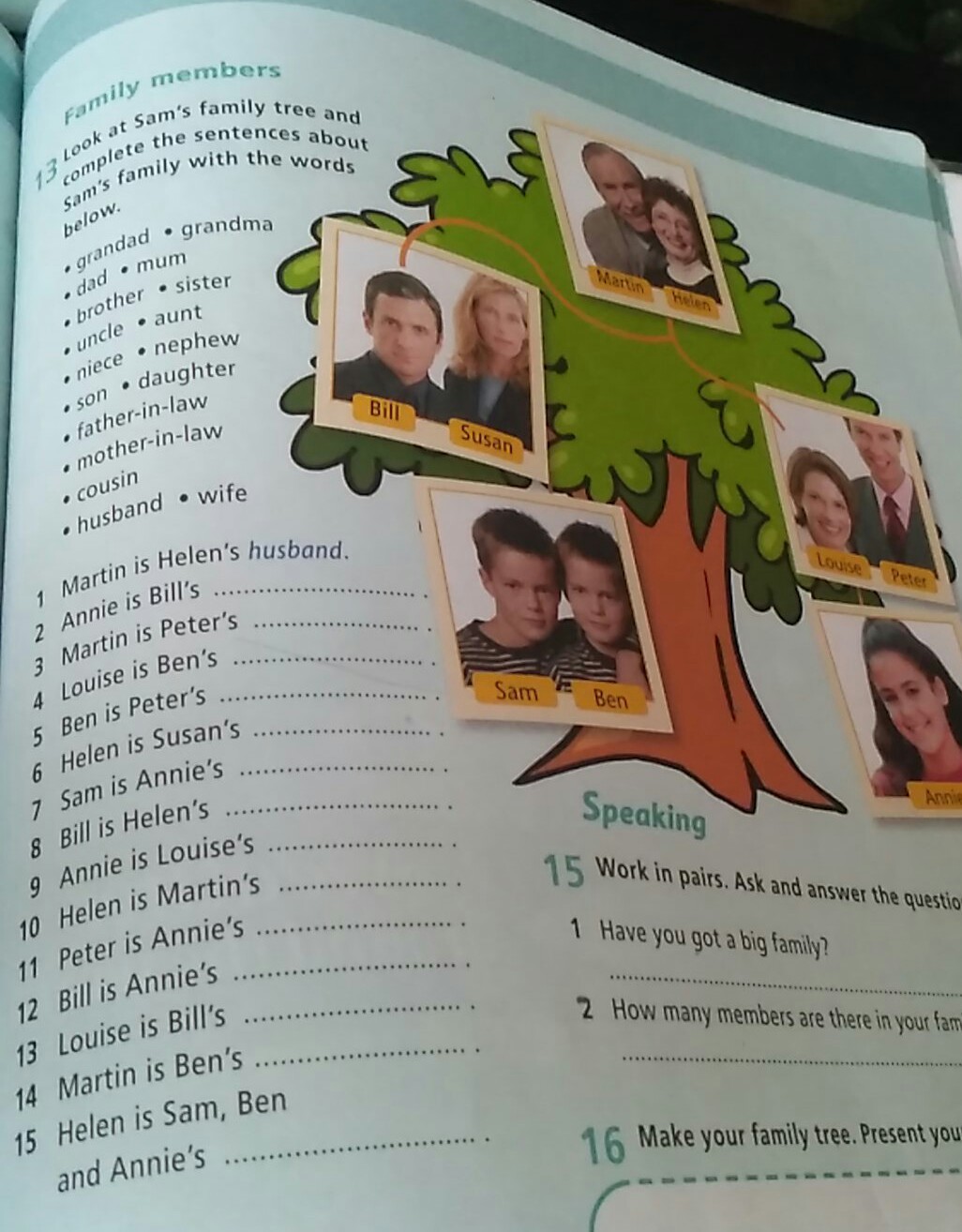Look at Sam's family tree and complete the sentences about Sam's family with the words