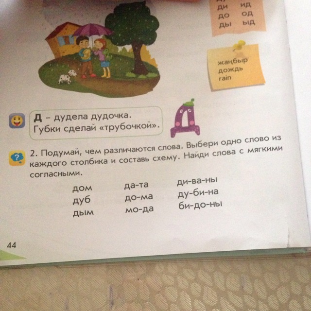 Слова с мягкими согласными: диваны ( д мягкая), дубина ( б мягкая), бидоны (б мягкая)