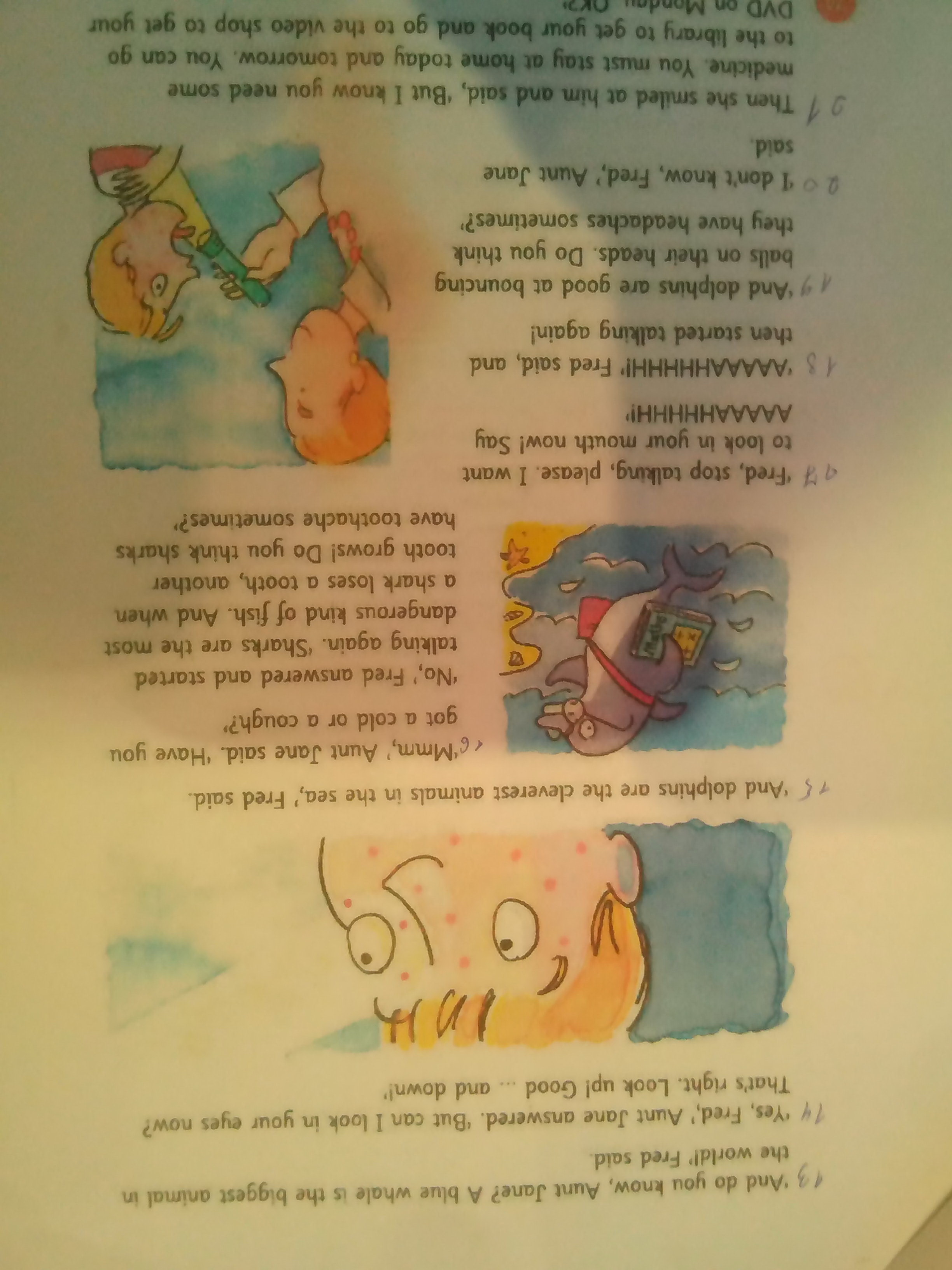 Затем Фред начал разговаривать. "Киты не пьют апельсиновый сок, но я думаю, у них иногда болит живот. У них очень большие желудки. А вы знали что они едят---"