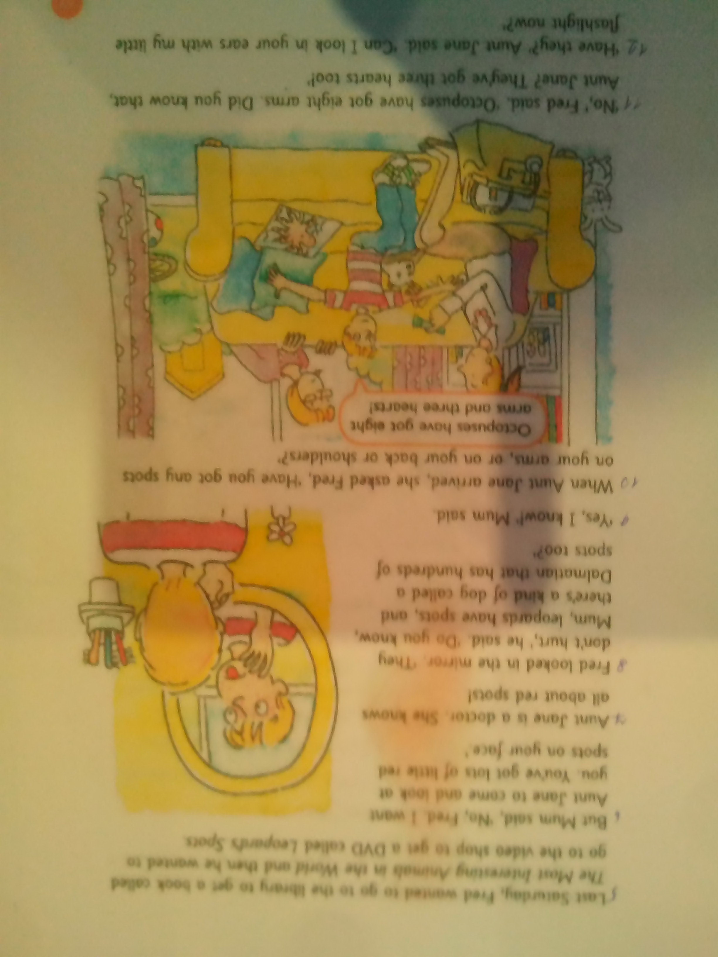 Фред посмотрел в зеркало."Они не болят" сказал он,"Мам, а ты знала, что у леопардов есть пятна, и есть порода собак Далматинцы, у которых тоже очень много пятен?"