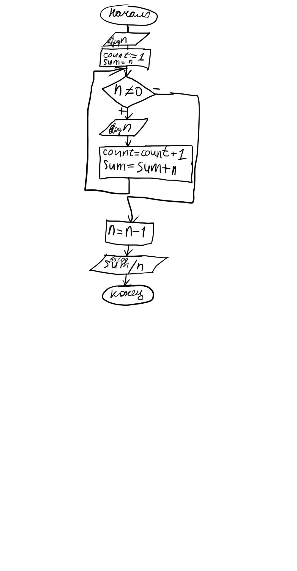 Алгоритм в виде блок схемы для нахождения среднего арифметического в последовательности чисел, которая заканчивается нулем. Ноль не считать.