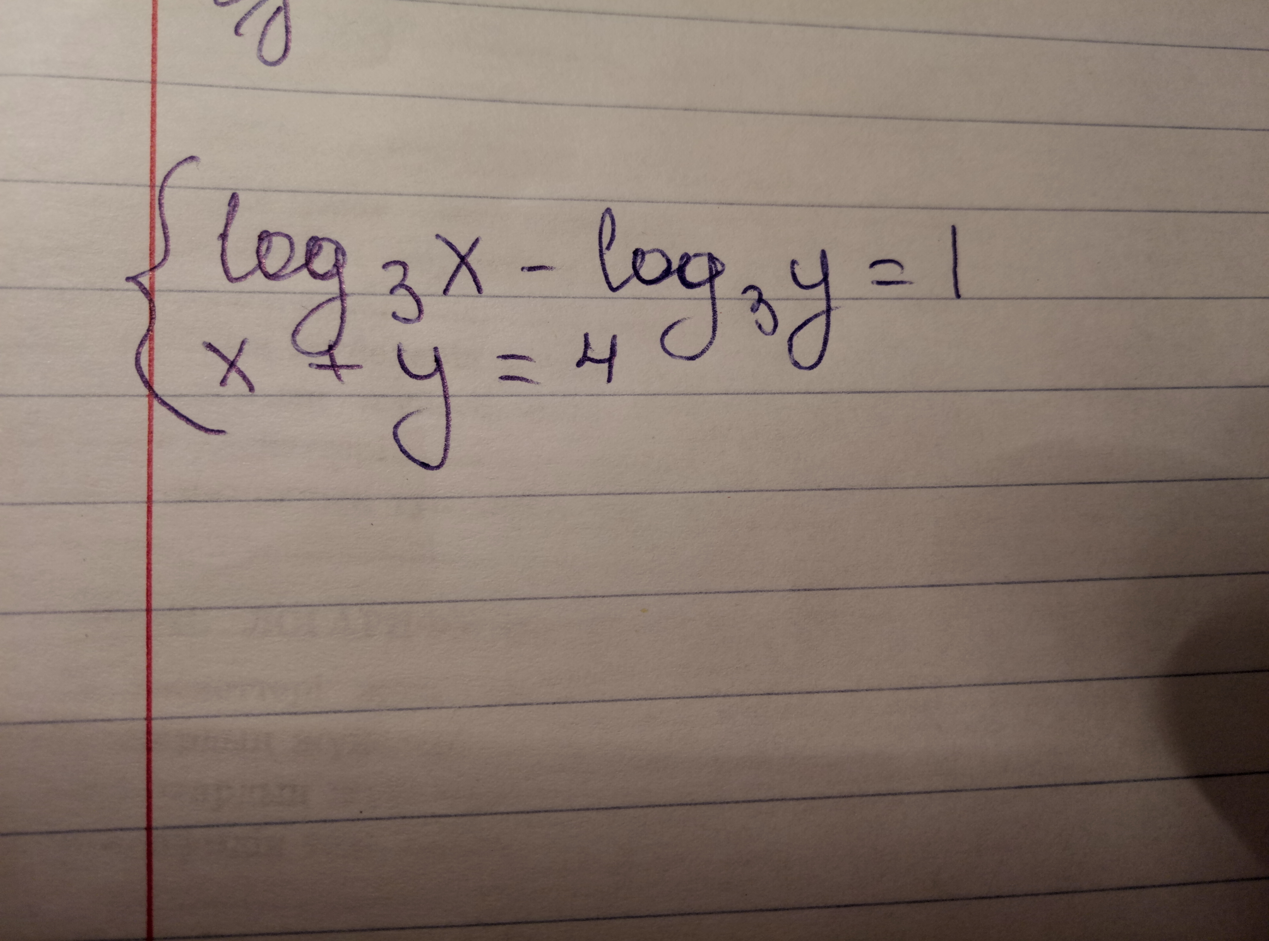 Смотри. Если разность логарифмов равна 1 - значит, у = 3 ^ а и х = 3 ^ (а + 1). Так как х + у = 4 <=> 3 ^ а + 3 ^ (а + 1) = 4. Такое при целых степенях возможно только при а = 0, то есть у = 1 и х = 3