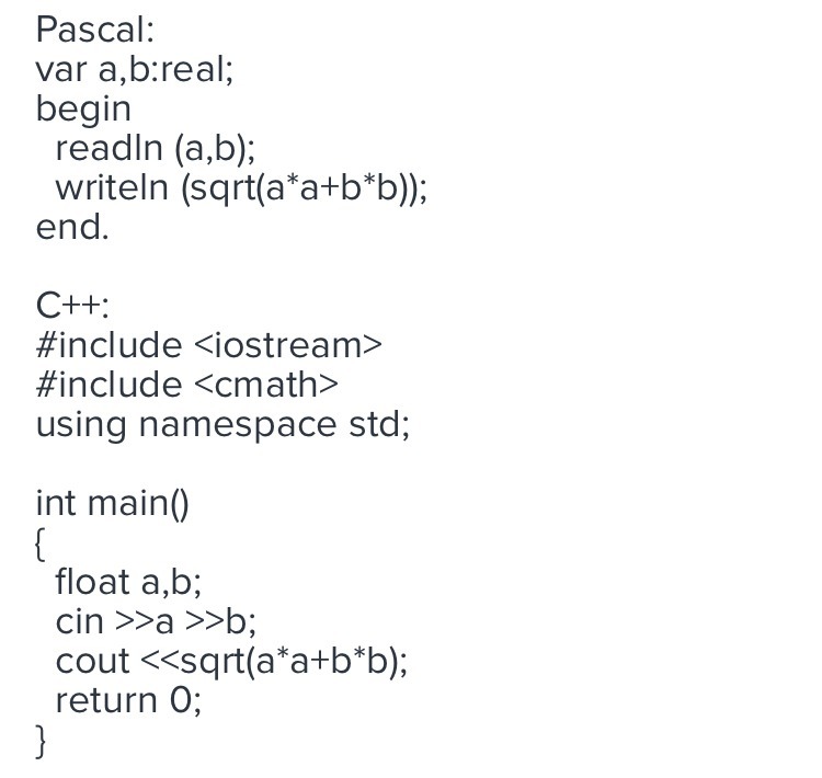 Дано два числа a и b. Найдите гипотенузу треугольника с заданными катетами.