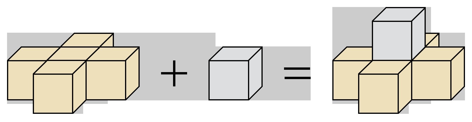 Найдите массу получившегося тела, если его средняя плотность оказалась равной 1,2ρ. Ответ выразите в г, округлив до целых. Все шесть кубиков являются сплошными и имеют одинаковые геометрические размеры. Массой клея пренебречь.