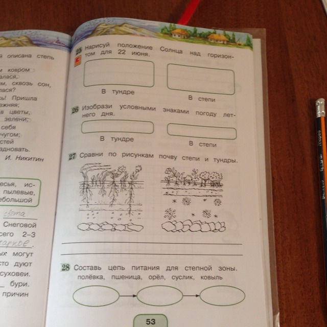 26. рисуете горку и справа солнышко с краю - это тундра, а степи три вертикальных палочки, верхушки которых наклонены в право