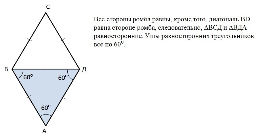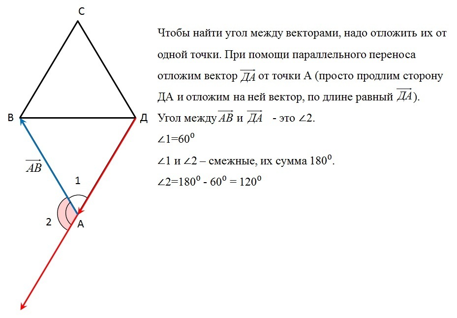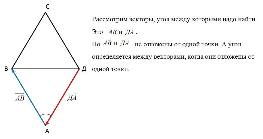Задача " Диагонали ромба ABCD пересекаются в точке О и диагональ BD равна стороне ромба . Найдите угол между векторами ... " Я не могу понять , почему угол между векторами AB и DA равен 120 , объясните (подробно) пожалуйста