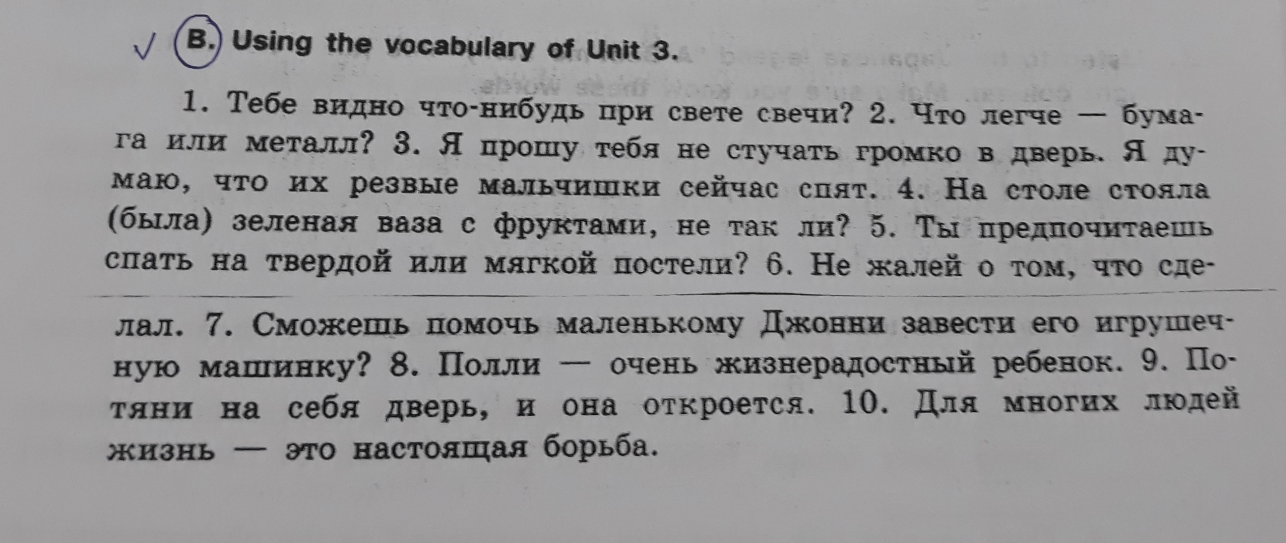1-Can you see something in the light of a candle? 2-Which is lighter--paper or metal?3-I am begging you dont pound loudly at the door 4-On the table was a green vase with fruits?Isnt it? 5-You prefer to sleep on a soft or hard bed?6-Dont pity about what you did7-Can you help little Johnny to start his toy car 8-Polly--very cheerful child 9-Pull the door on yourself and it will open 10-For many people life--real struggle