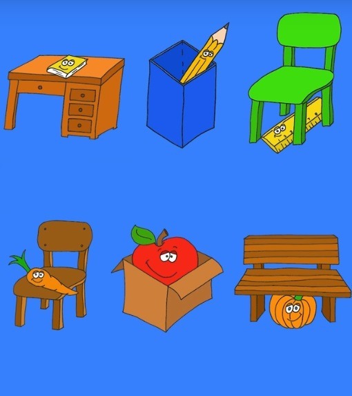 3) The carrot is (on/in/ander) the . (desk/box/chair/bench)