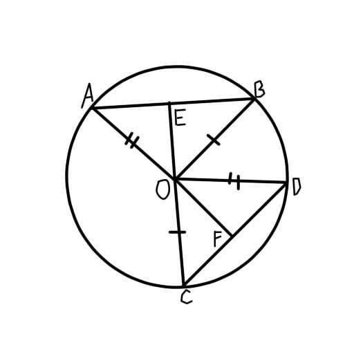 Что ж, ОА, ОВ, OD, OC - все равны, как радиусы. АВ и СD равны по условию. Так что треугольники ОАВ и OCD равны по трем сторонам.