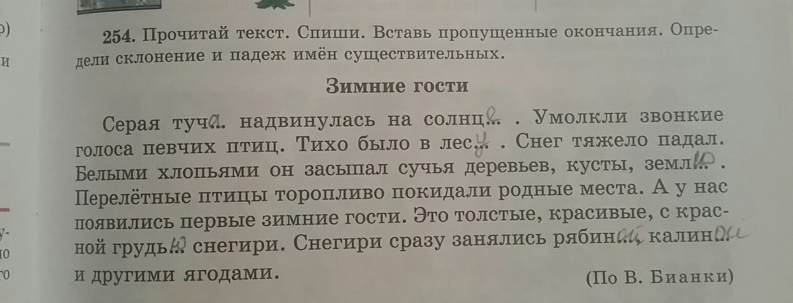 туча(и.п.,1скл.,.),на солнце (п.п.,2скл.,.),в лесу(п.п.,2скл.,),землю(в.п.,1скл.,)с грудью(т.п.,3скл.,)рябиной(т.п.,1скл.,),калиной(т.п.,1скл.)