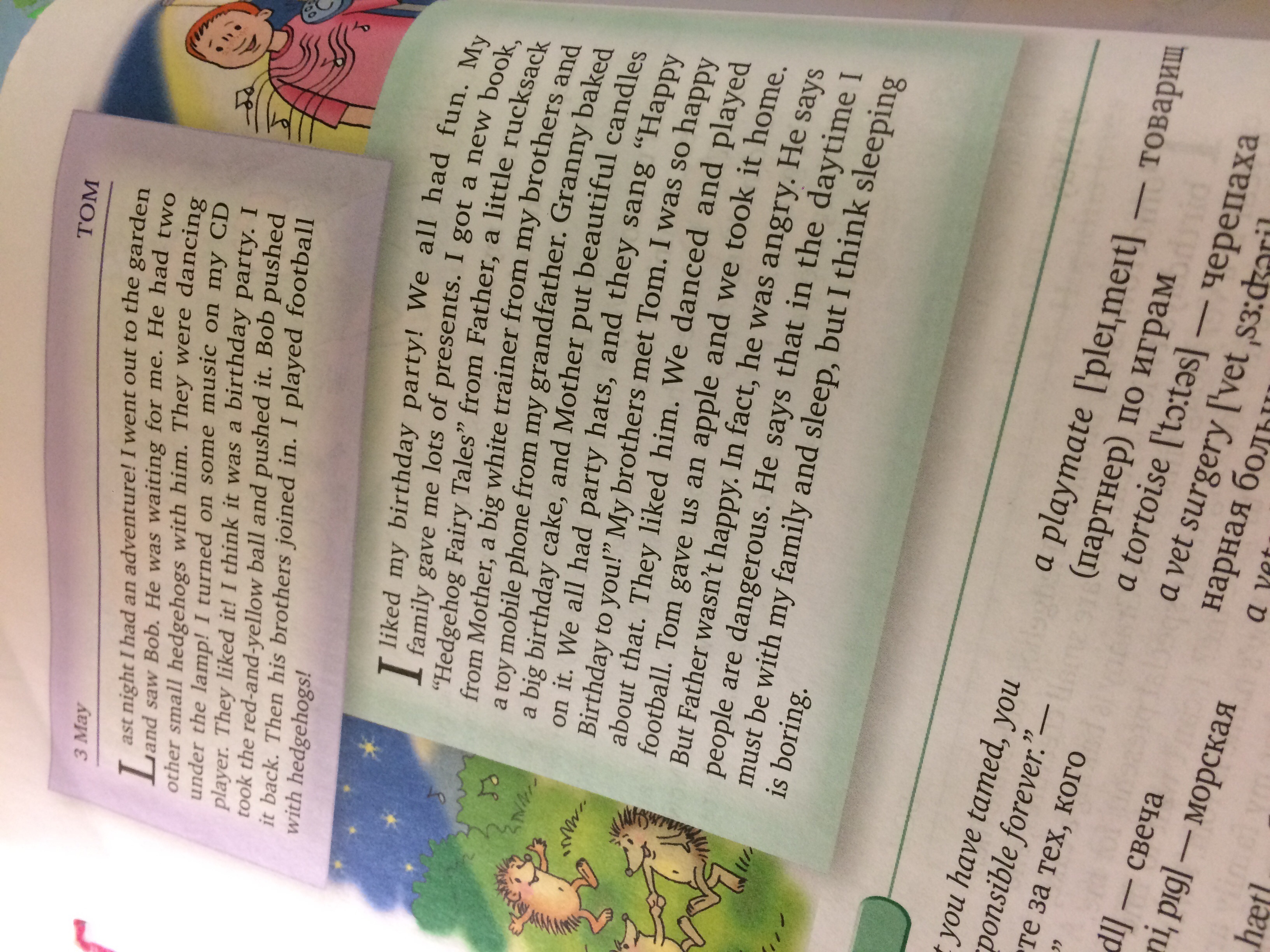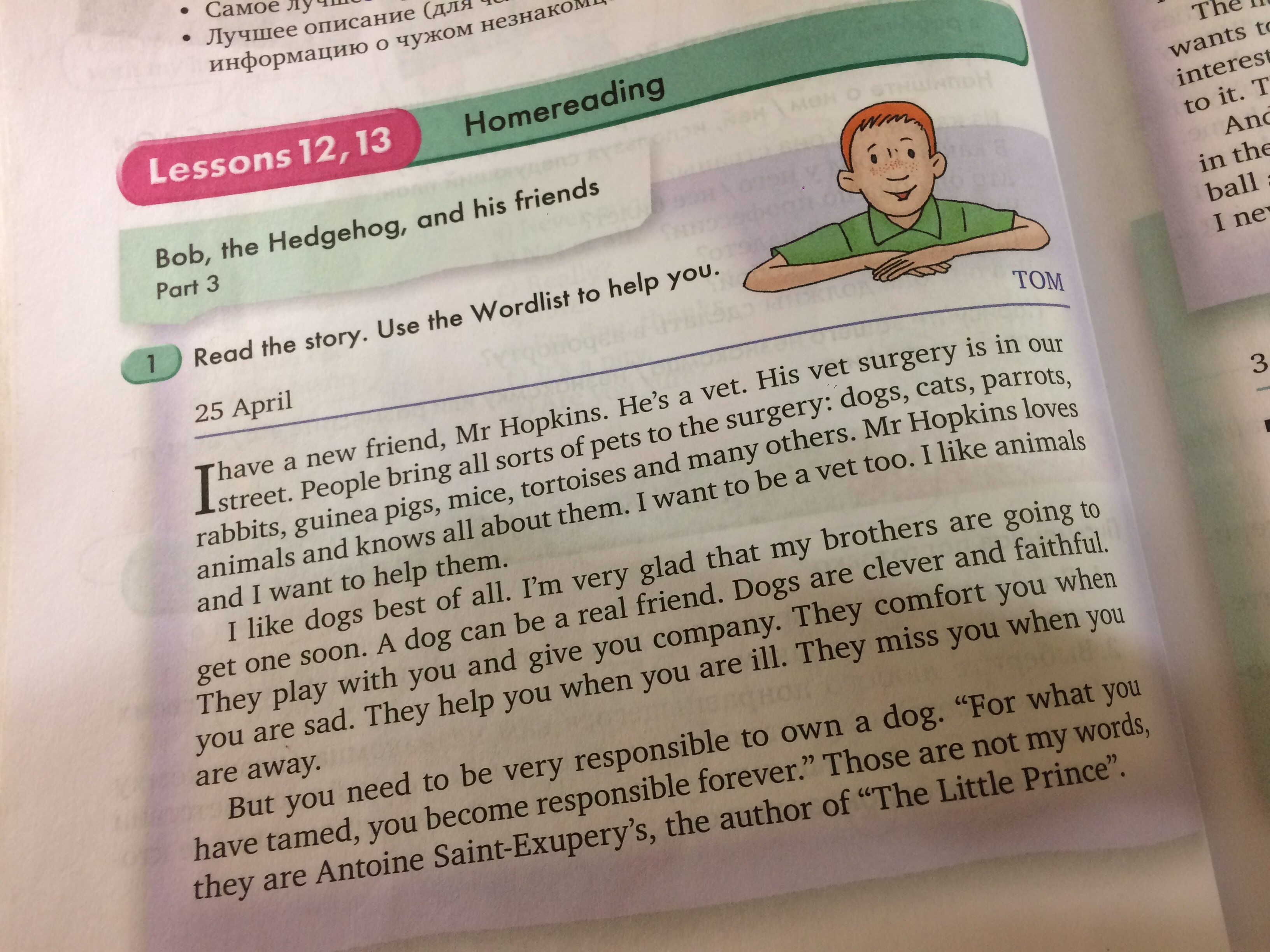 У меня есть новый друг, его зовут Мистер Хопкинс. Он ветеринар. Его ветеринарная хирургия находится на нашей улице. Люди приносят все виды животных: собак,кошек,попугаев, кроликов, морских свинок,мышей,черепах и многих других. Хопкинс любит животных и знает все о них. Я хочу быть ветеринаром тоже.Я люблю животных и хочу помогать им.