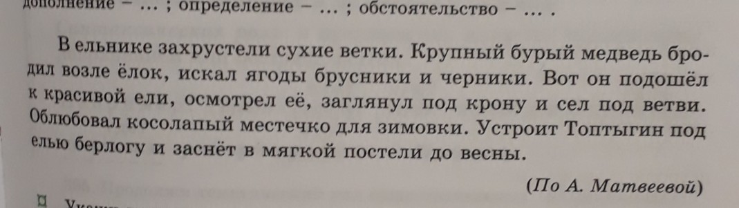 1. В ельнике (где? обстоятельство) захрустели (Что сделали? сказуемое) сухие (какие? определение) ветки(что? подлежащее).2. Крупный (определение) бурый (определение) медведь (подлежащее) бродил (сказуемое) возле (обстоятельство) ёлок (дополнение), искал (сказуемое) ягоды (дополнение) брусники (дополнение) и (союз) черники (дополнение).3 Вот (указательная частица) он (подлежащее) подошёл (сказуемое) к красивой (определение) ели (дополнение), осмотрел (сказуемое) её (дополнение), заглянул (сказуемое) под крону (обстоятельство или дополнение ( на твой вкус;)) и (союз) сел (сказуемое) под ветви (обстоятельство или дополнение ( на твой вкус;)).4 Облюбовал (сказуемое) косолапый (определение) местечко (дополнение) для зимовки (дополнение).5 Устроит (сказуемое) Топтыгин (подлежащее) под елью (обстоятельство или дополнение ( на твой вкус;)) берлогу (дополнение) и (союз) заснёт (сказуемое) в постели (обстоятельство или дополнение ( на твой вкус;)) мягкой (определение) до весны (дополнение).