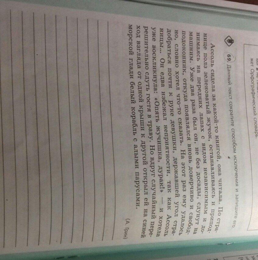 Ассоль сидела за книгой,читала. По странице полз жучок,останавливаясь и приподнимаясь на передних лапах. Два раза был он сдунут на подоконник,откуда появлялся вновь,словно хотел что-то сказать. На этот раз ему удалось добраться почти к руке. Он едва избежал неприятности,так как Ассоль воскликнула:»Жучишка,дурак!»- и хотела сдуть гостя. Но вдруг случайный переход взгляда открыл ей на морской глади корабль с алыми парусами.