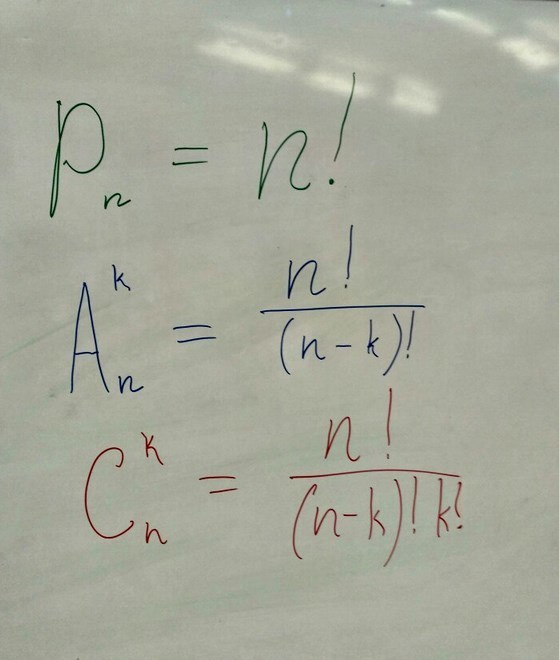 Третье - количество сочетаний. Это количество неупорядоченных наборов. То есть, если найти все упорядоченные наборы, и потом отбросить все повторы (то есть количество перестановок в каждом наборе, то есть к!), то мы получим стандартную операцию деления, которая и отображена в вашей формуле.