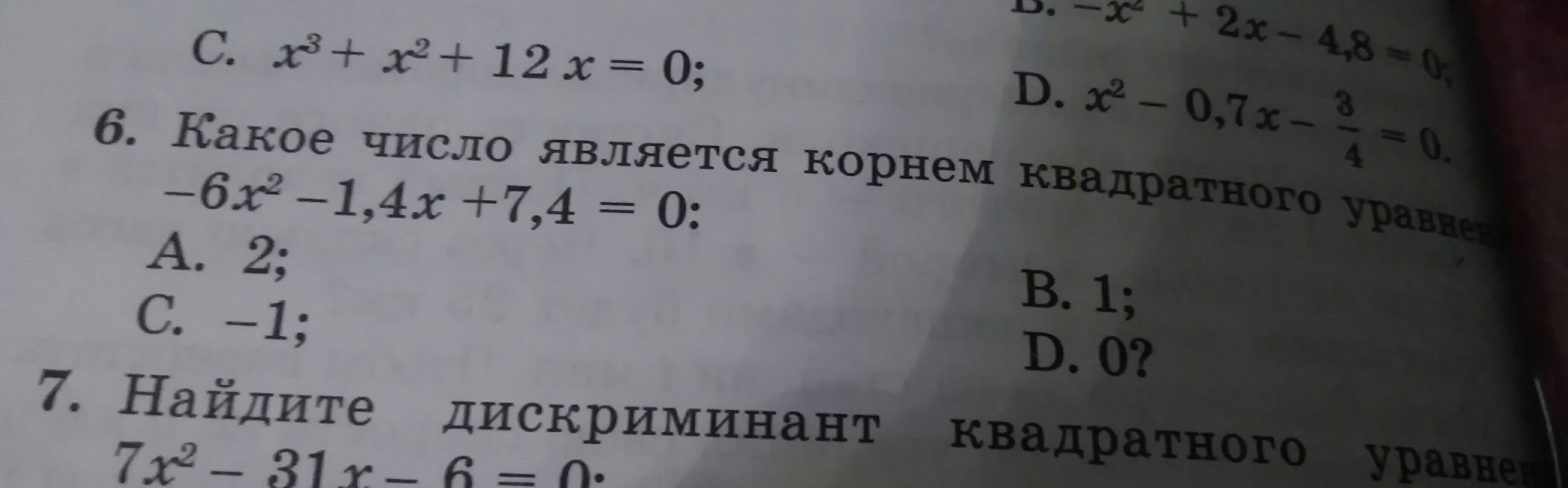 6 {x}^{2}  + 1.4x - 7.4 =0 \ d  = {1.4}^{2}  - 4 times 6 times ( - 7.4) = 179.56 =  {13.4}^{2} \x =  frac{ - 1.4 +  - 13.4}{2 times 6}   \ x1 = 1 \x2 =   frac{ - 14.8}{12}  =   - frac{74}{10}  times  frac{1}{12}  =  -  frac{37}{60}