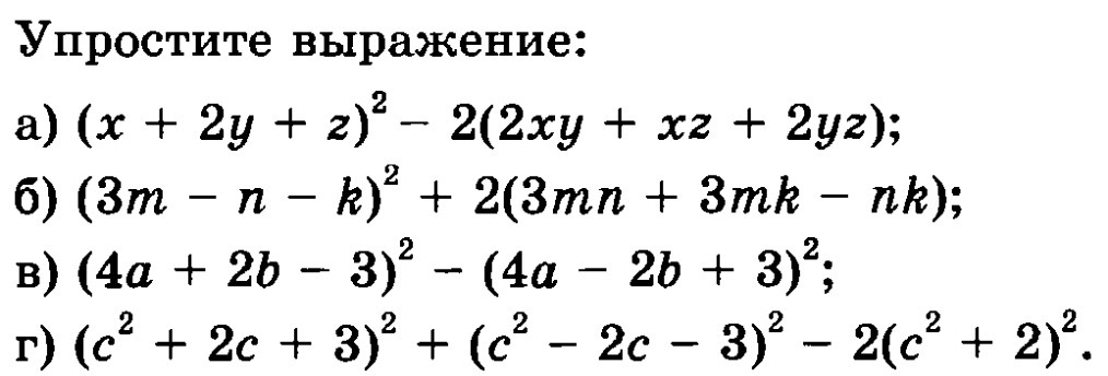 б) (3m - n - k)²+ 2(3mn + 3mk - nk) = 9m²+ (-n)²+ (-k)²- 6mn - 6 km + 2kn + 2(3mn + 3km - kn) = 9m² + (-n)² + (-k)² - 6mn - 6km + 2kn + 6mn + 6km - 2kn = 9m² + n² + k²