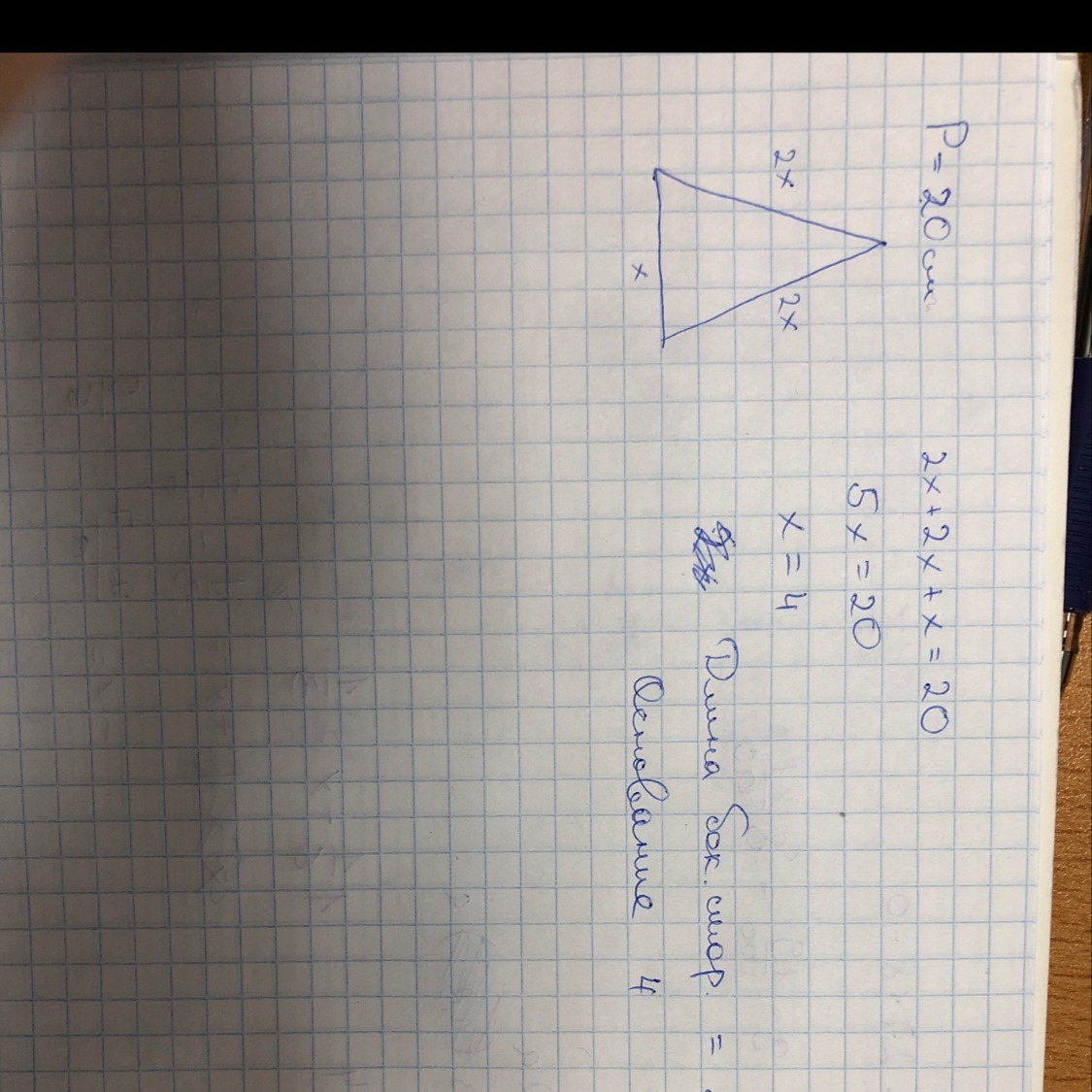 Периметр равнобедренного ∆=20см его основания меньше боковой стороны в 2 раза .найдите длины сторон ∆
