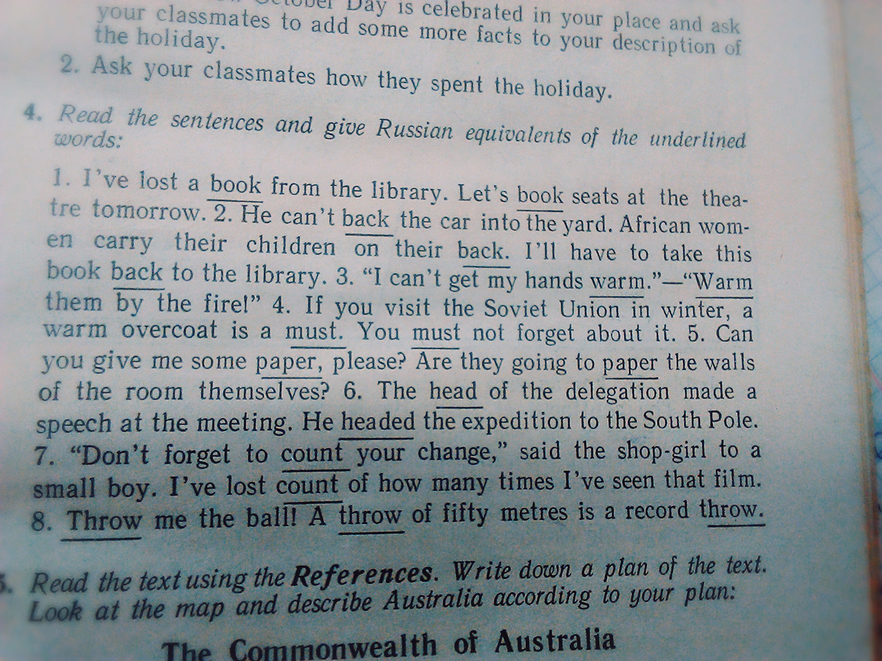 1) Я потерял книгу из библиотеки. 2) Давайте забронируем места в завтрашнем дне он не может поддержать машину во дворе. Африканский труд несут своих детей на спину. Мне придется вернуть эту книгу в библиотеку. 3. «Я не могу оторвать руки от рук! 4. Если вы посещаете зиму Союза, теплое пальто обязательно. Вы не должны забывать об этом. 5. Можете ли вы дать мне какую-нибудь бумагу, пожалуйста? Собираются ли они самим писать стены комнаты? 6. Глава делегации выступил на заседании. Он возглавил экспедицию на Южный полюс 7. «Не забудьте засчитать свое изменение, - сказала девушка магазина маленькому мальчику. Я потерял счет, сколько раз я видел этот фильм. 8. Бросай мне мяч! Бросок пятидесяти метров - рекордный бросок.