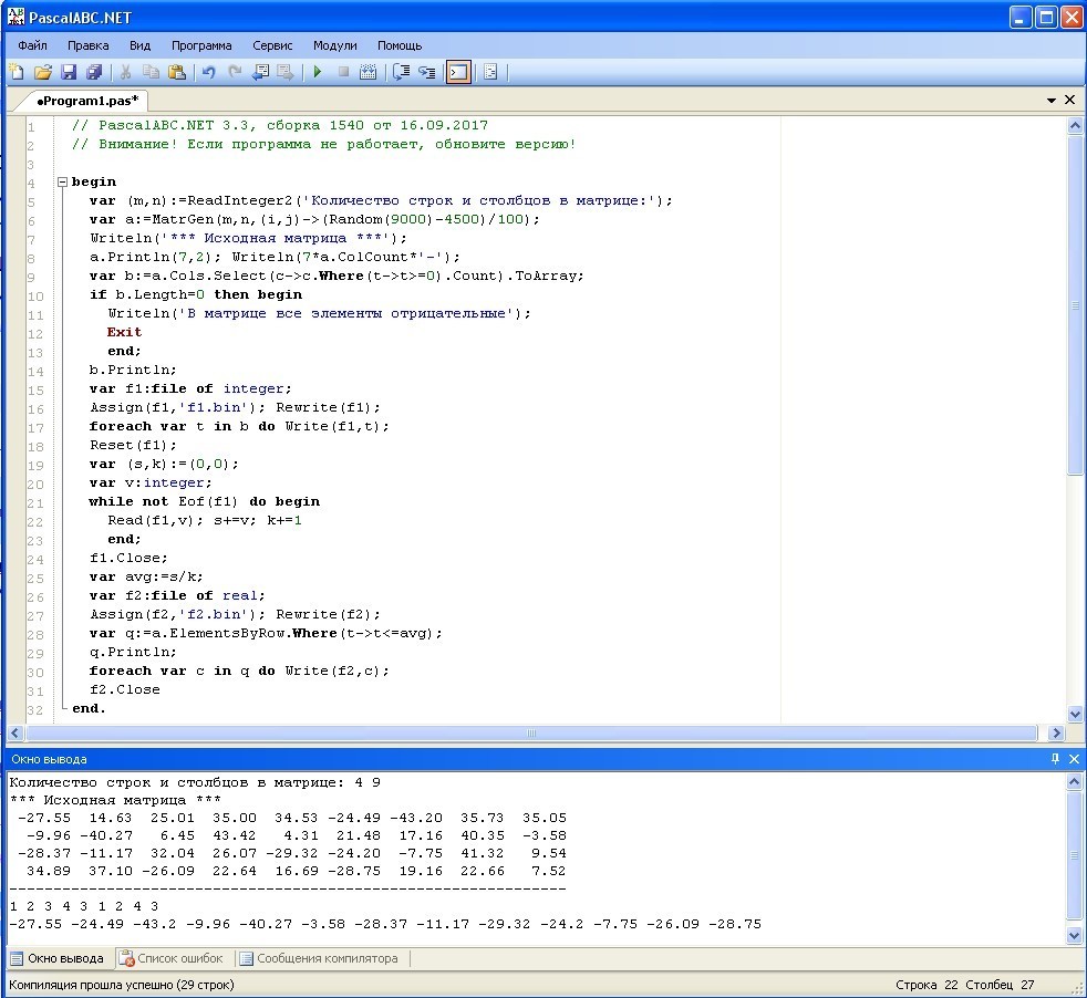 дана действительная матрица размера m×n. Получить одномерный массив, элементы которого равны количеством неотрицательных элементов в столбцах. вывести элементы полученного массива на экран и в типизированный дисковой файл f1. Вычислить среднее арифмитическое значение элементов файла f1. Вывести в файл f2 те элементы файла f1, которые не превышают найденного среднего. использовать при решении подпрограммы.