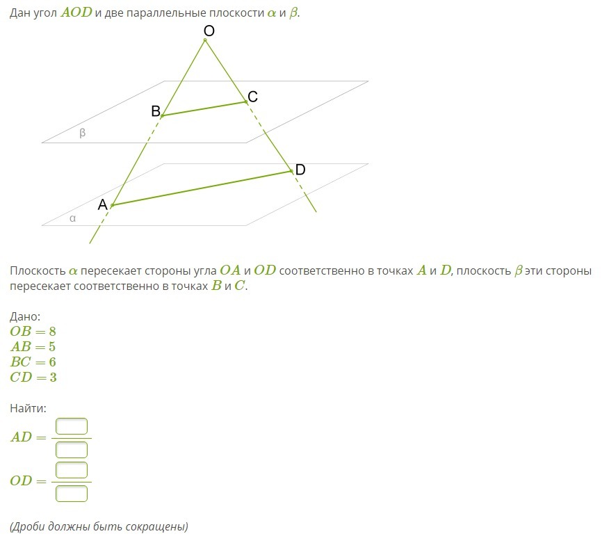 У тебя плоскости параллельные, значит и лежащие в них прямые тоже будут между собой параллельны. Рассмотрим треугольника BOC и AOD, они подобны по 3 углам ( A=B , C=D, O - общий), значит, составим отношения. АО = АВ + ВО = 13 OД = ОС + 3