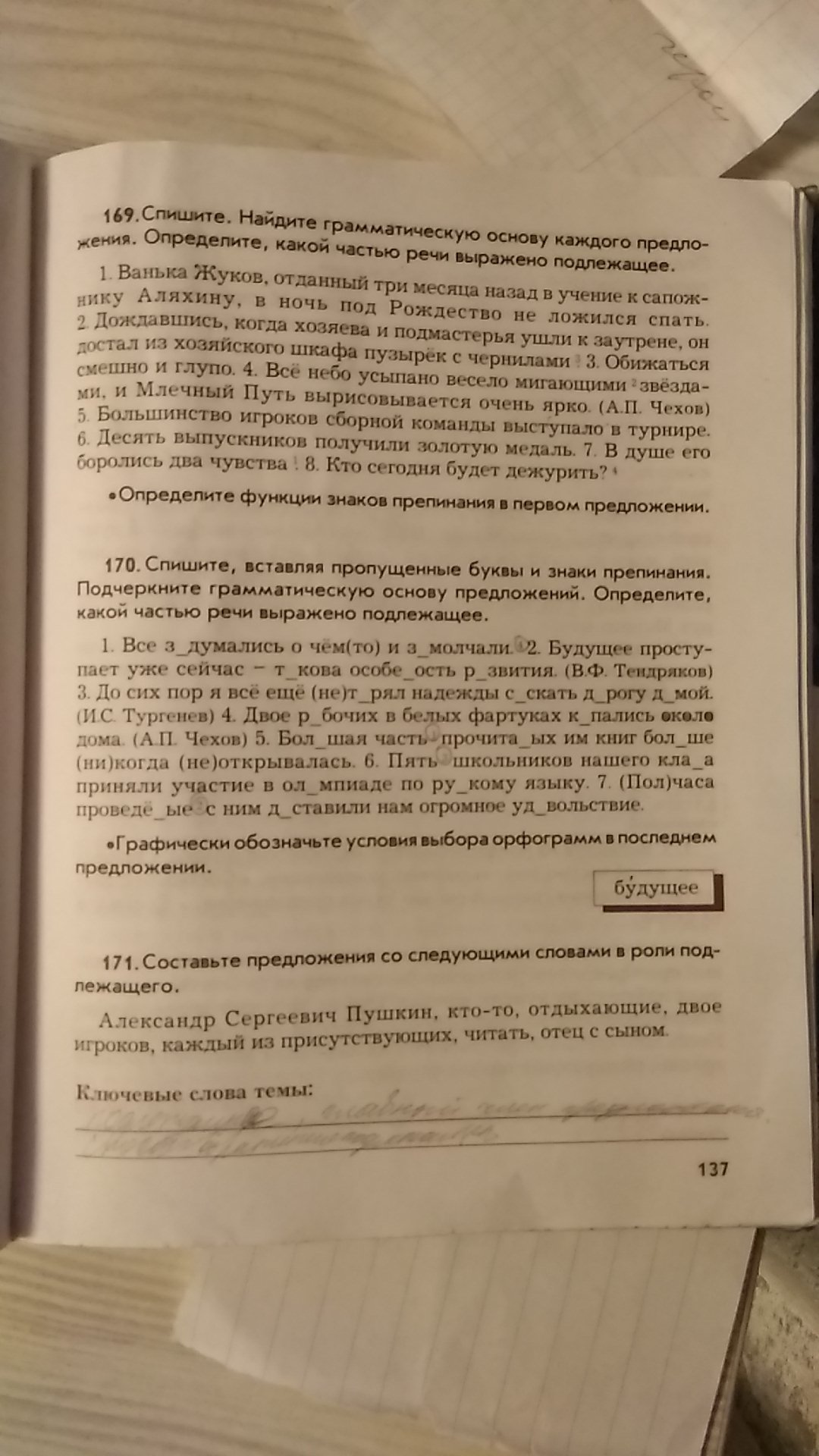 2. Будущее(подлежащее, выражено прилагательным в значении существительного), проступает(сказуемое); особенность (подлежащее, выражено существительным) такова (сказуемое).