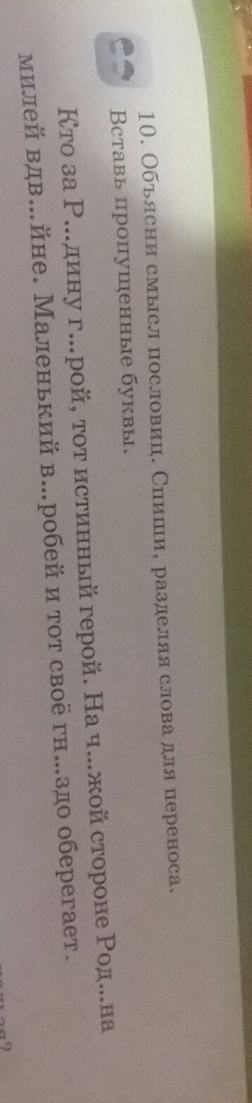 Кто за Ро-ди-ну ге-рой, тот ис-тин-ный ге-рой. На чу-жой сто-ро-не Ро-ди-на ми-лей вдвой-не. Ма-лень-кий во-ро-бей и тот своё(не делится для переноса) гнез-до обе-ре-га-ет(первый слог для переноса не считается).
