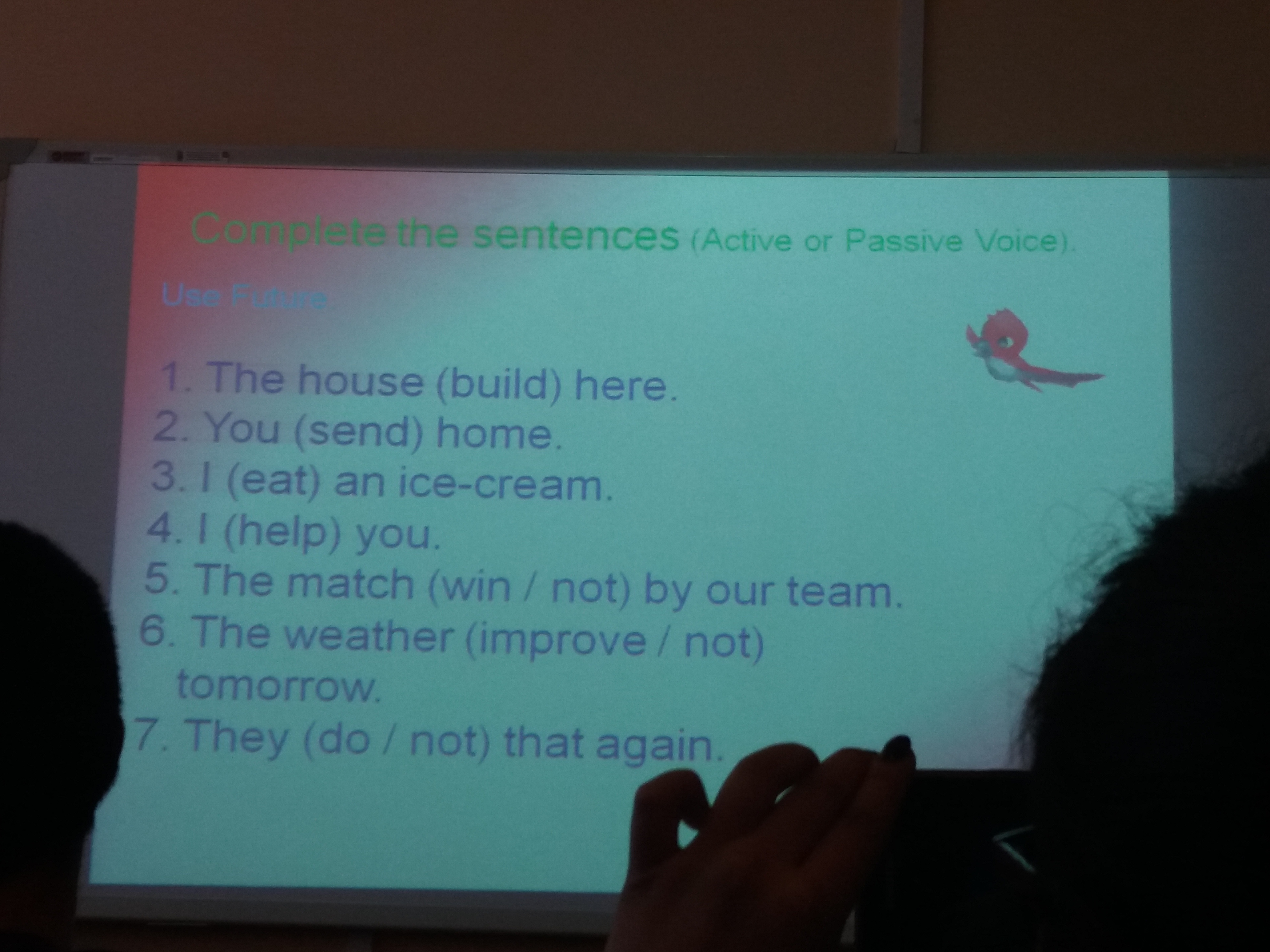 1. Дом (построить) здесь. 2.Вы (отправьте) домой. 3.I (есть) мороженое. 4. Я помогаю тебе. 5. математика (победа / нет) нашей командой. 6. погода (улучшить / нет) завтра. 7. Они (do / not) это снова.
