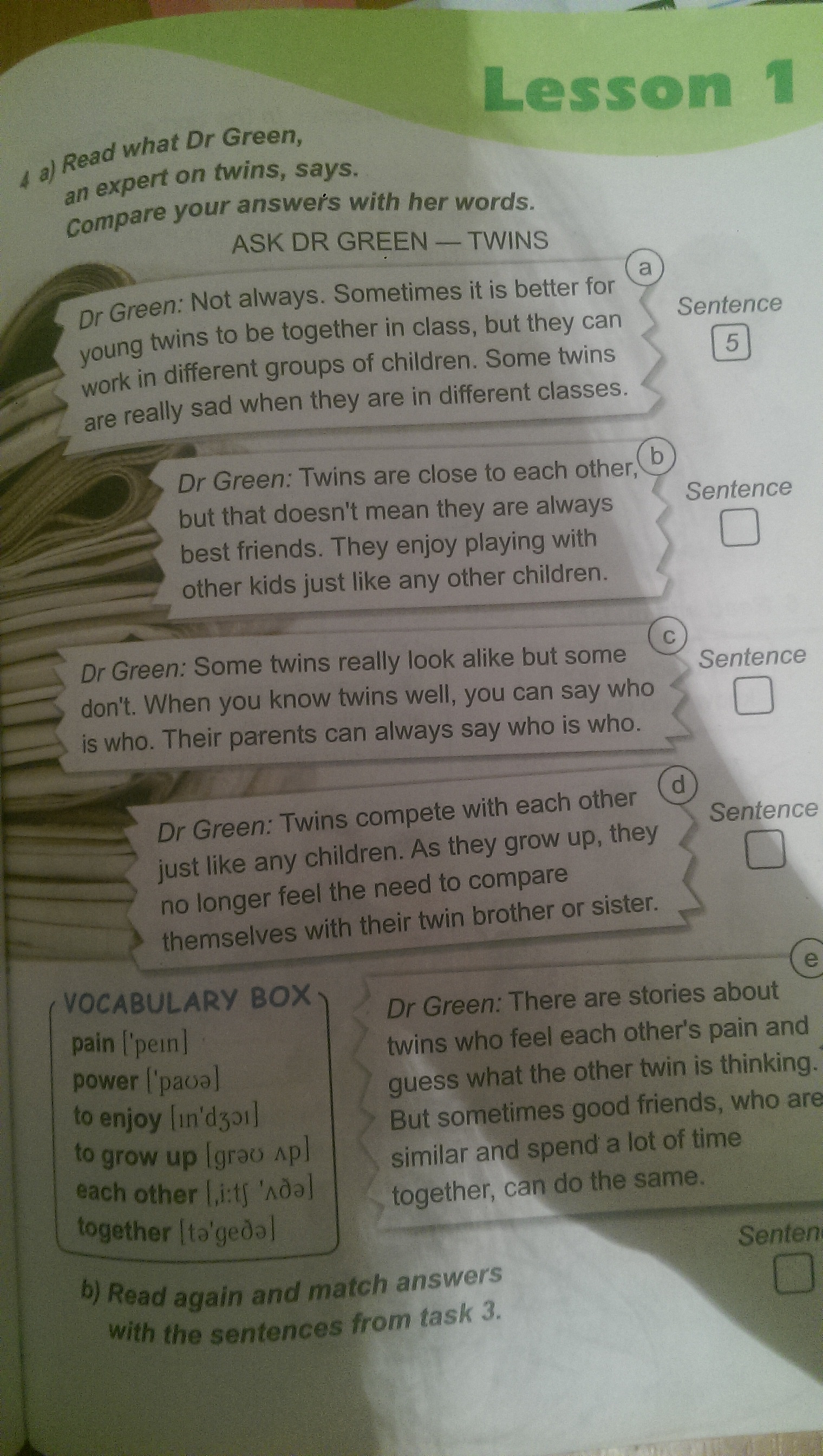 Д-р Грін: не завжди но іноді краще для близнюків бути разом в класі, але вони можуть працювати в різних групах дітей. Деякі близнюки дійсно сумують, коли вони знаходяться в різних класах.Д-р Грін: Близнюки близькі один до одного, але це не означає, що вони завжди є кращими друзями. Вони люблять грати з іншими дітьми як і будь-які інші діти.Д-р Грін: близнюки дуже схожі, але деякі не схожі. Коли знаєш, що близнюки добре, ви можете сказати, хто є хто, їхні батьки завжди можуть сказати, хто є хто.Д-р Грін: Близнюки змагаються один з одним, як і будь-які діти. Як вони виростають, вони більше не відчувають потреби порівнювати себе з їх брат-близнюк або сестра.
