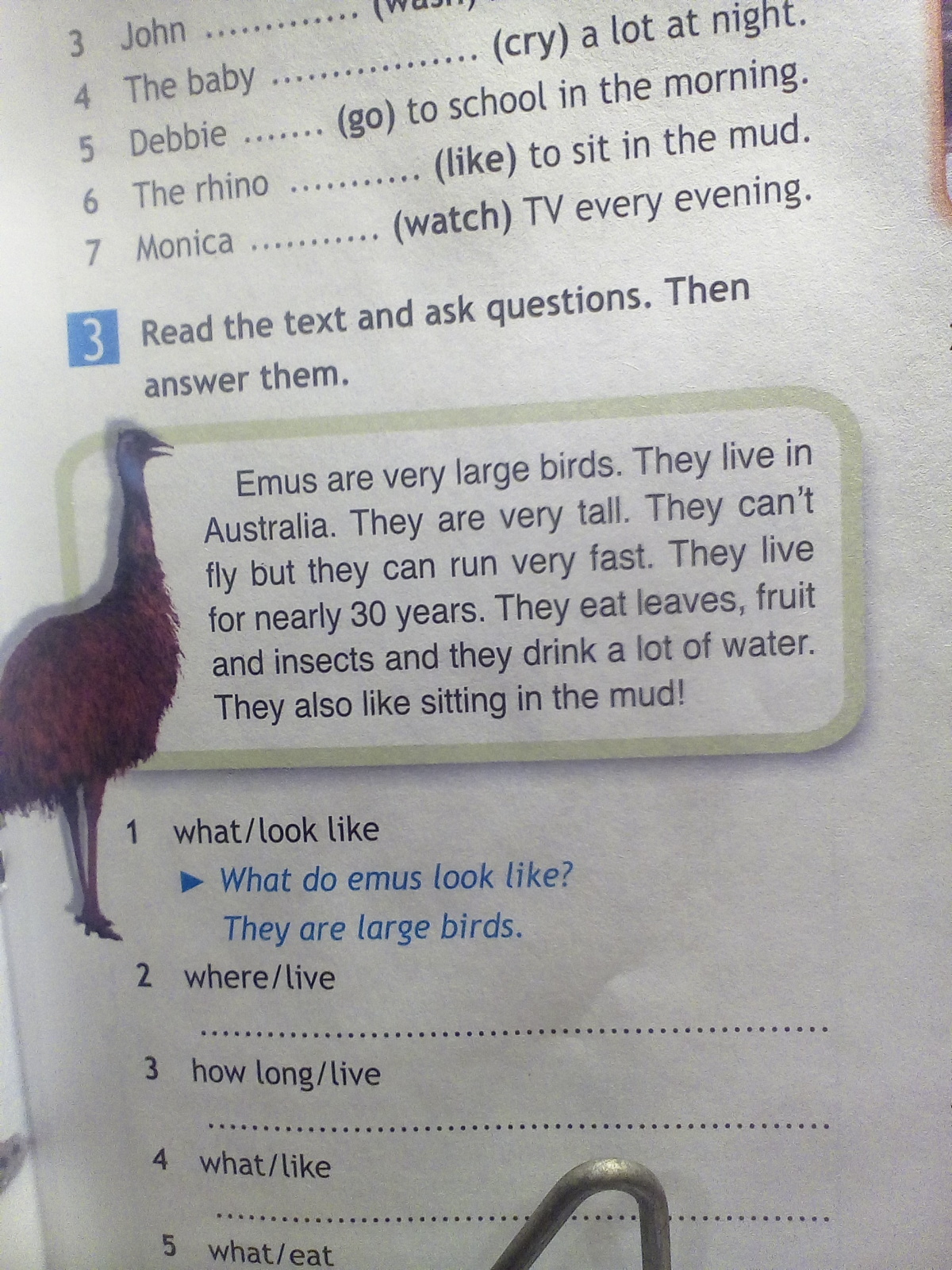 Эму очень большие птицы. Они живут в Австралии. Они очень высокие. Они не могут летать, но бегают очень быстро. Они живут около 30 лет. Они едят листья, фрукты и насекомых, и пьют много воды. Также им нравится сидеть в грязи!