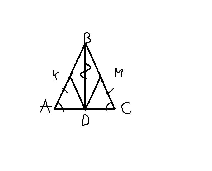 В равнобедренном треугольнике ABC точки K и M являются серединами боковых сторон AB и BC соответственно. BD-медиана треугольника. Докажите, что треугольник AKD= треугольнику CMD.
