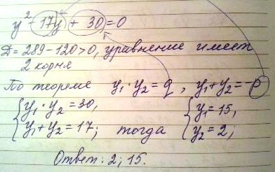 Произведение двух чисел одного знака равно 30. Это могут быть, например, 1 и 30, 2 и 15, 3 и 10, 5 и 6. Проверяем то, что сумма этих чисел в паре была равна 17. Такому условию удовлетворяет только пара 2 и 15, она и является парой корней уравнения.