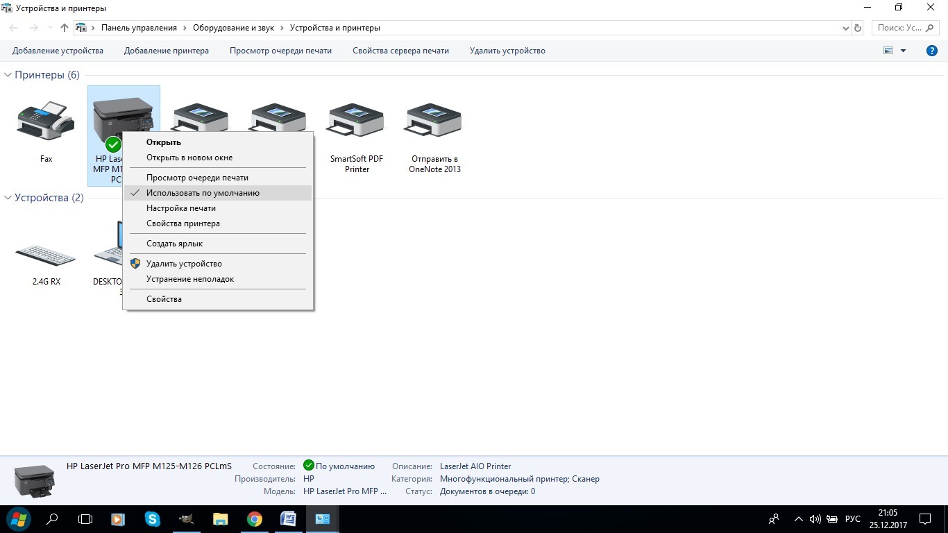 Как убрать галочку у принтера HP "Использовать по умолчанию", чтобы сразу можно было использовать несколько принтеров