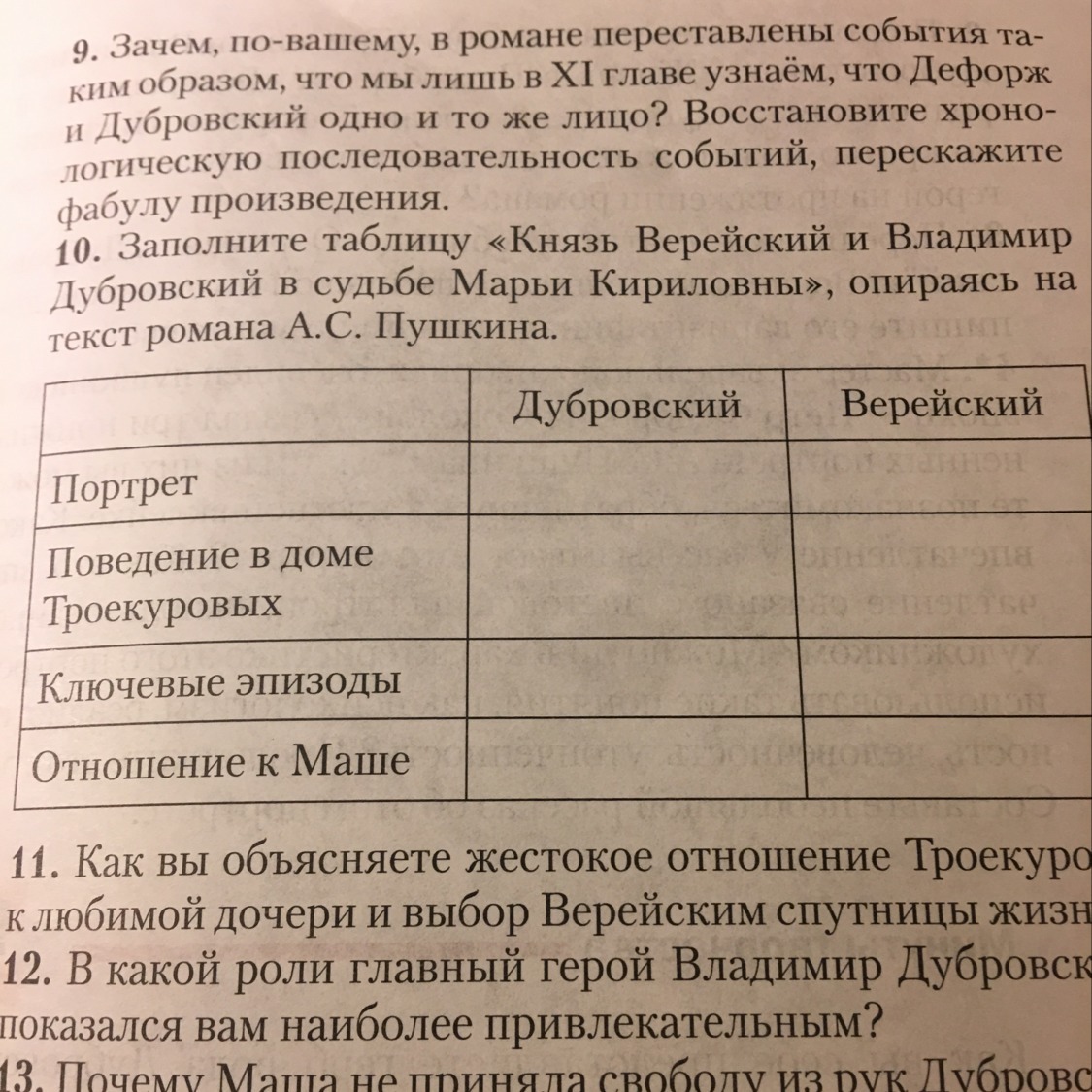 9)фабула нарушена автором умышленно, дабы сохранить интригу.Дефорж является как бы второй личиной Дубровского, но читатель может сам догадаться об этом, автор разделил одного героя на двух, т.к. их характеры и образ жизни различны.