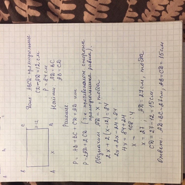 Перимитр прямоугольника 84 см. Найти стороны если одна меньше другой на 12. Пожалуйста с Дано и решением. Буду блогодарен