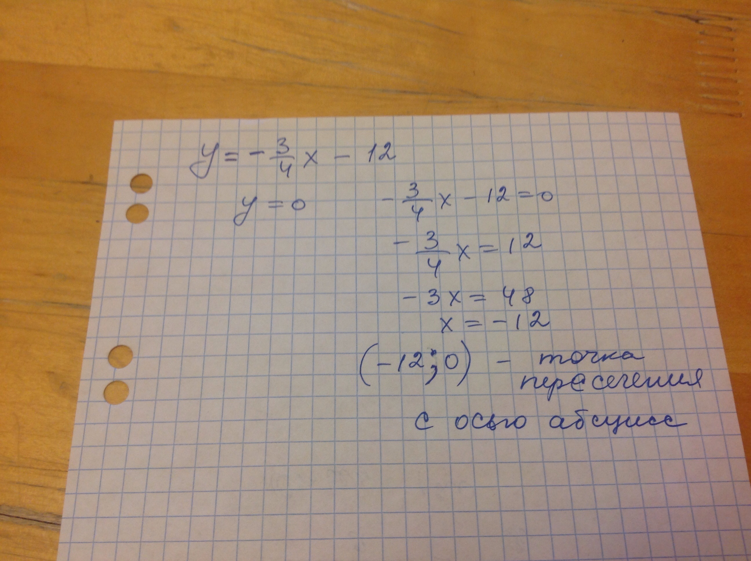 Найдите координаты точки пересечения функции игрик равно минус три четвёртых икс минус двенадцать с осью абсцисс помогите пажалуйста завтра соч по алгебре