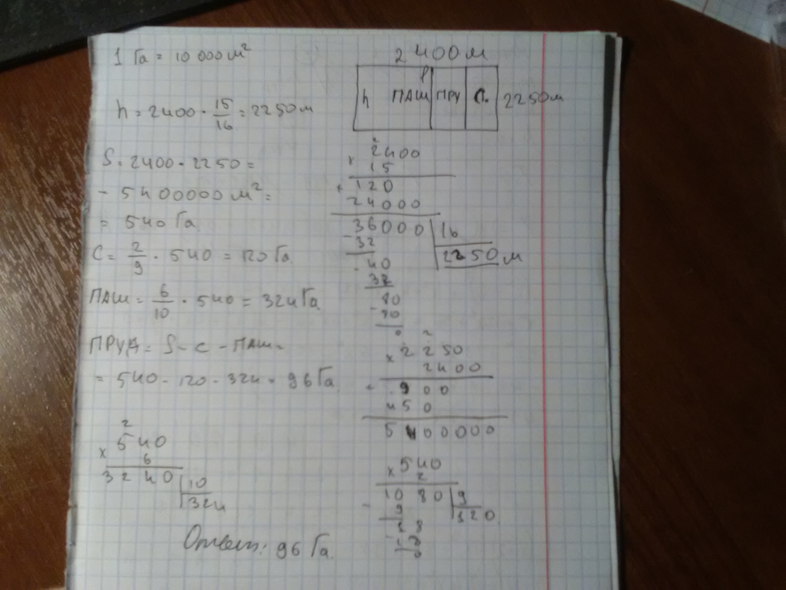 Участок земли имеет форму прямоугольника. Длина участка 2400 м, а ширина составляет 15/16 длины : 2/9 этого участка занято садом 0,6- пашней, а остальное занимает пруд. Сколько гектаров участка занимает пруд