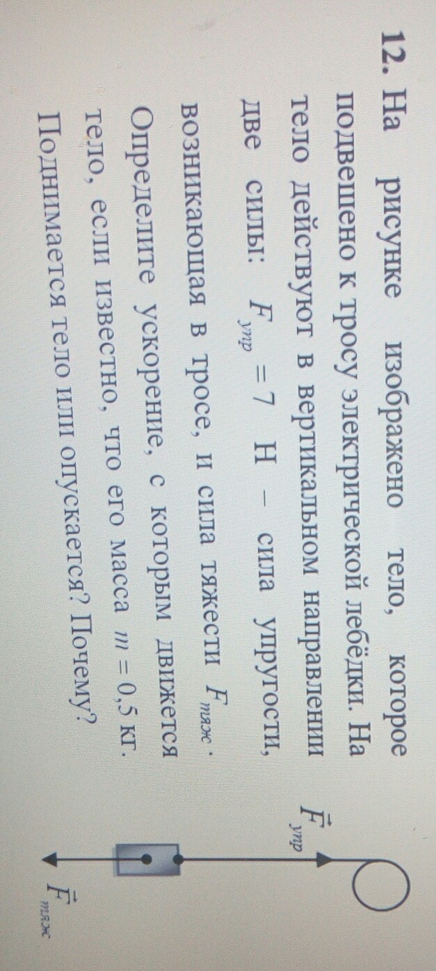 на рисунке изображено тело, которое подвешено к тросу электрической лебедки. На тело действуют в вертикальном направлении две силы: F=7 H - сила упругости, возникающая в тросе, и сила тяжести. Определите ускорение с которым движется тело, если известно что его масса m=0,5 кг. Поднимается тело или опускается? Почему?