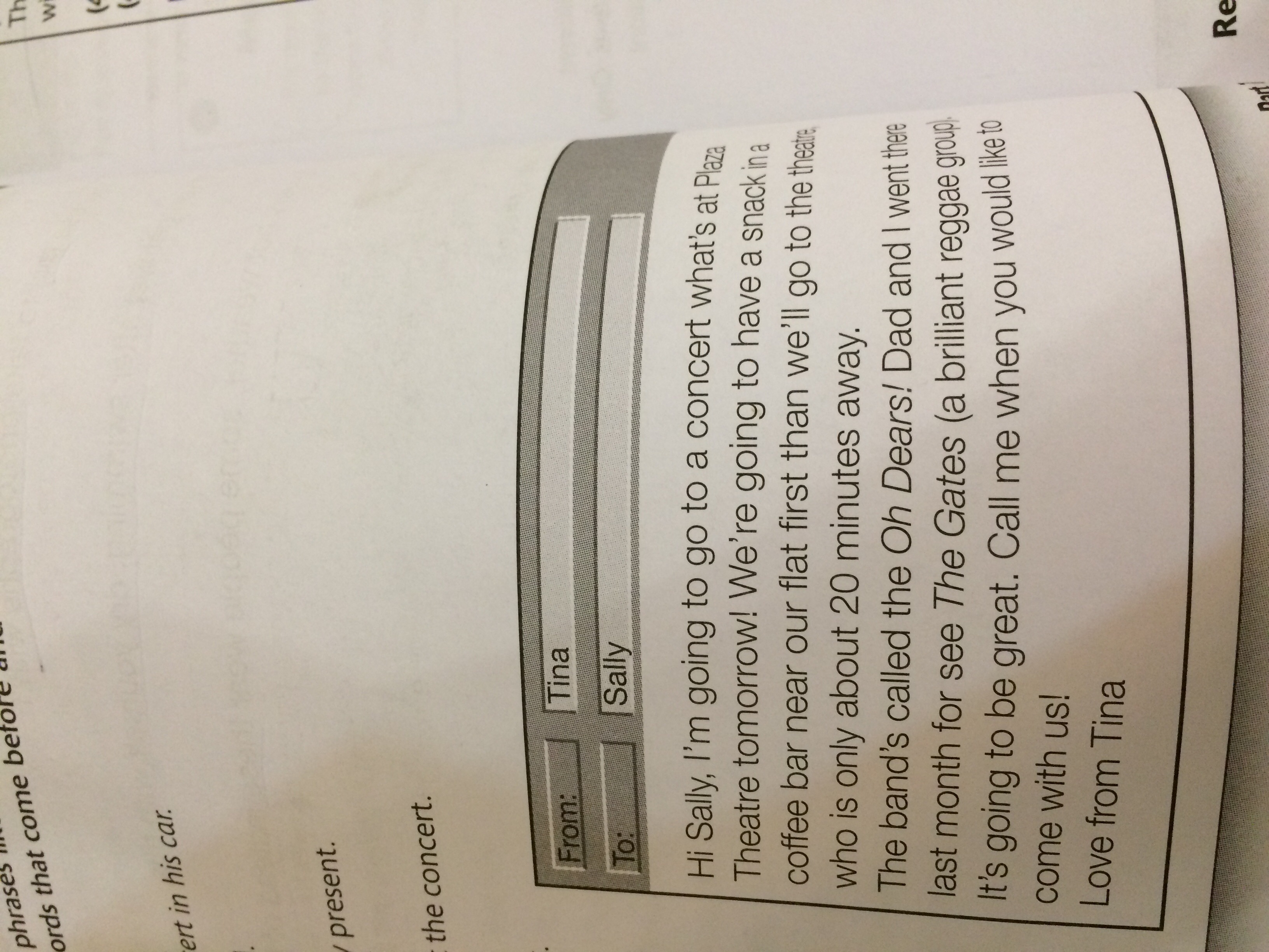 Hi Sally, I'm going to a concert that's at the Plaza Theatre tomorrow! We're going to have a snack in the coffee bar near our flat first, then we'll go to the theatre which is only 20 minutes away. The band's called the Oh dears! Dad and I went there last month to see The Gates (a brilliant reggae group). It's going to be great. Call me if you would like to come with us!