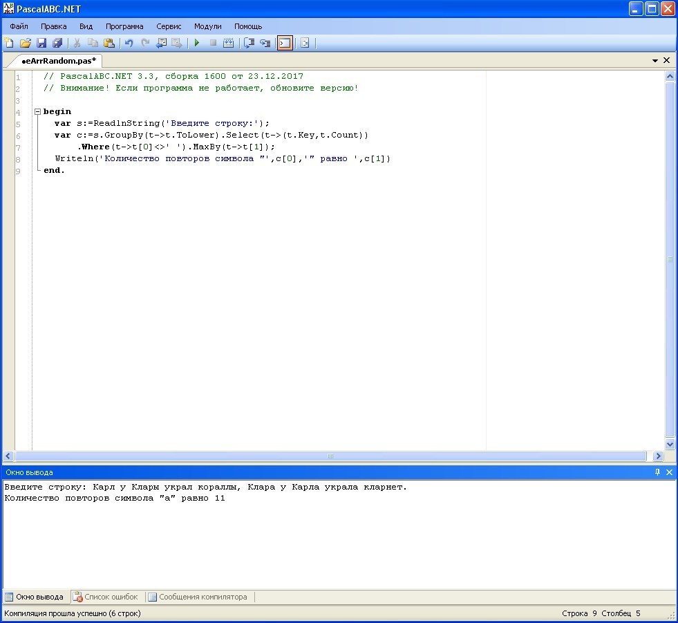 Writeln('Количество повторов символа "',c[0],'" равно ',c[1])