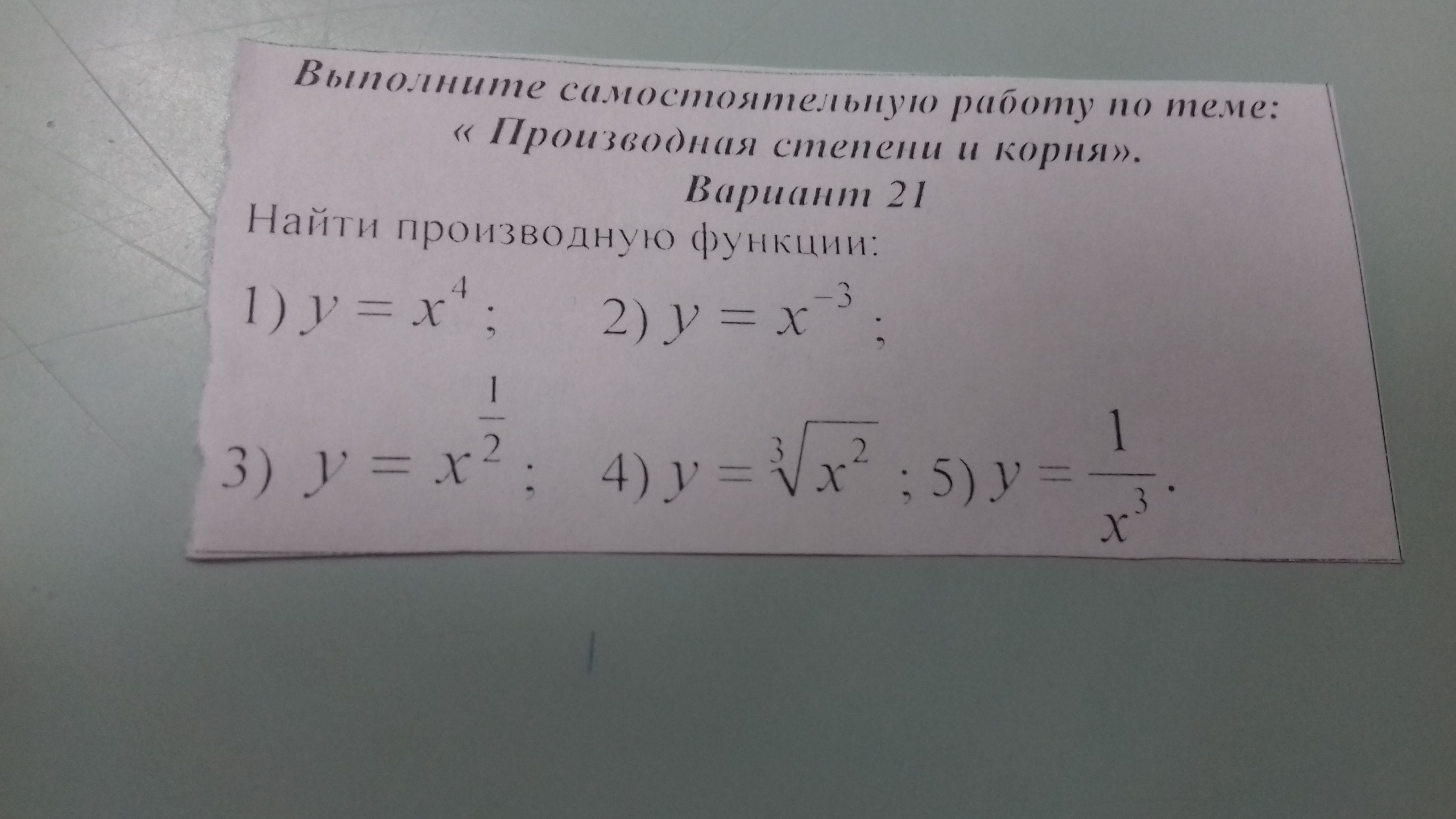 1) y= x^4 ; f’(x)=(x^4)’=4x^4-1=4x^3; 2)y=x^1/2 ; f’(x)=(x^1/2)’ = 1/2x^1/2-2/2=1/2x^-1/2; 3)y=x^-3; f’(x)=(x^-3)’=-3x^-3-1= -3x^-4; 4) y=3^(x^2); f’(x)=(x^2/3)’= 2/3x^2/3-3/3=2/3x^-1/3= 2/3(3^(x)); 5)y=1/x^3; f’(x) = (1/x^3)’= (x^-3)’=-3x^-4=-3/x^4;