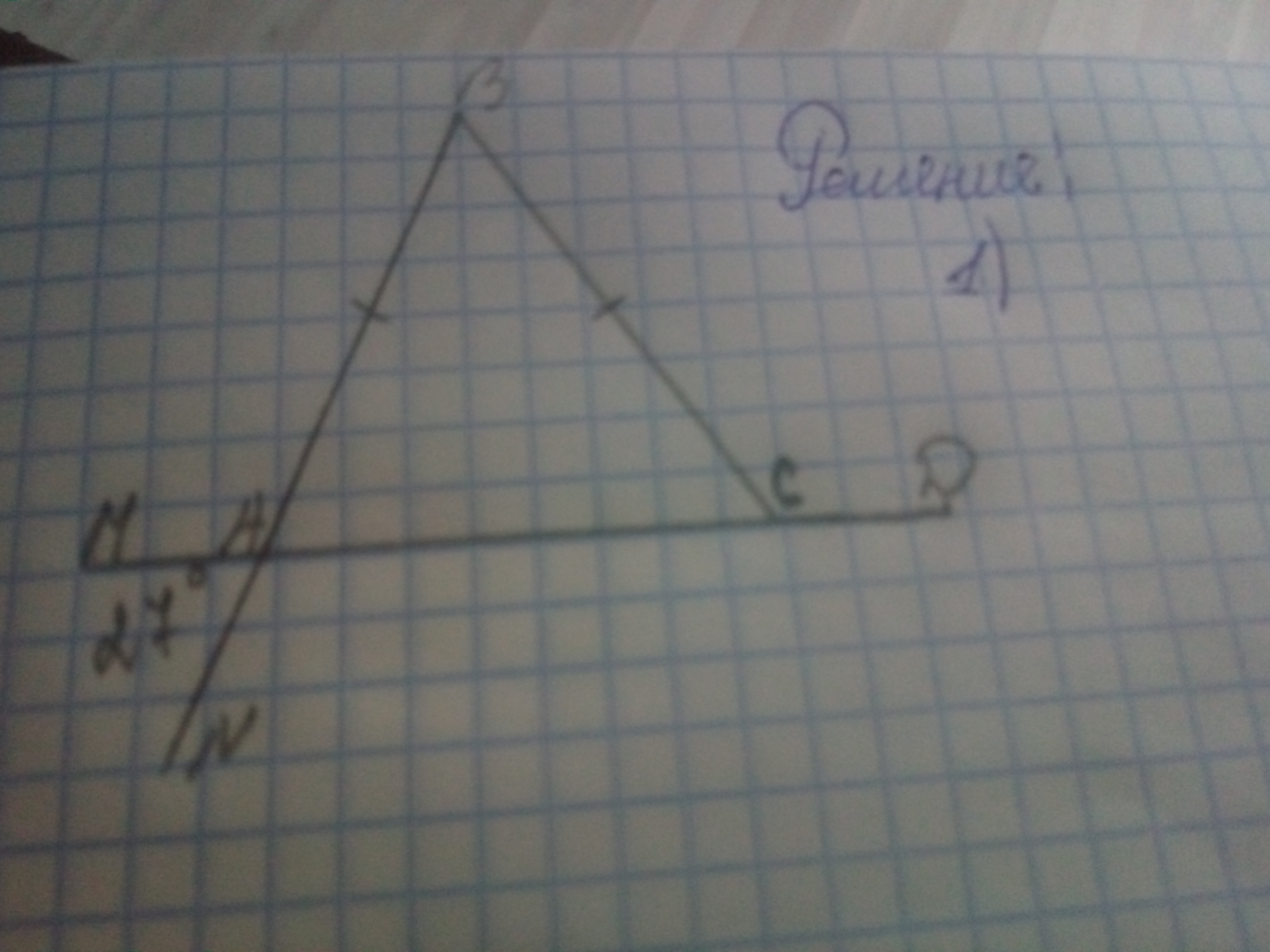 B = 180 - A - C = 180 - 27 - 27 = 126