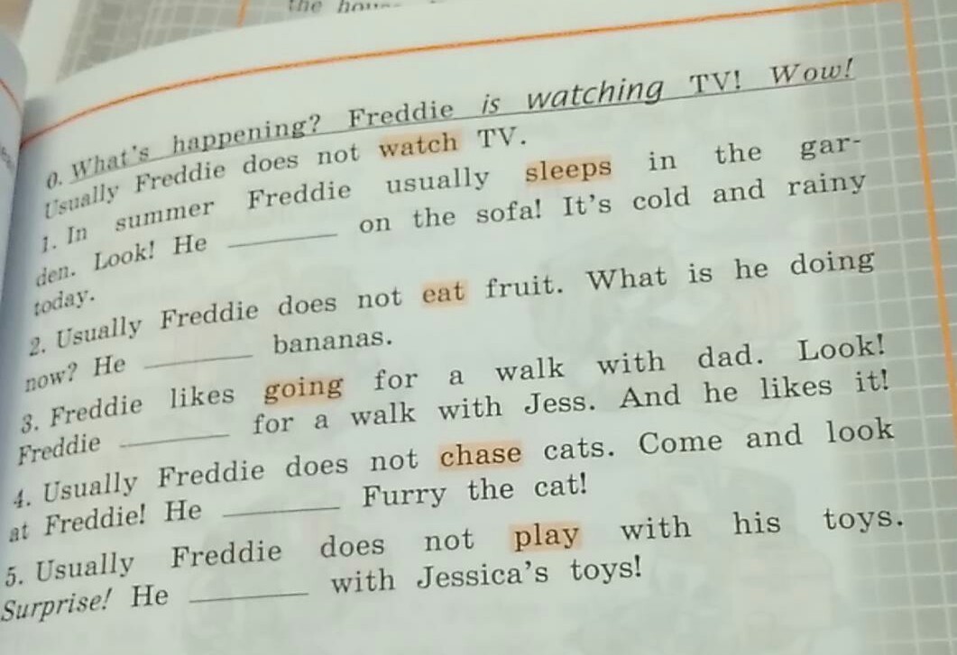 1.he on sofa 2.he eat bananas 3.he 4.on 5.play
