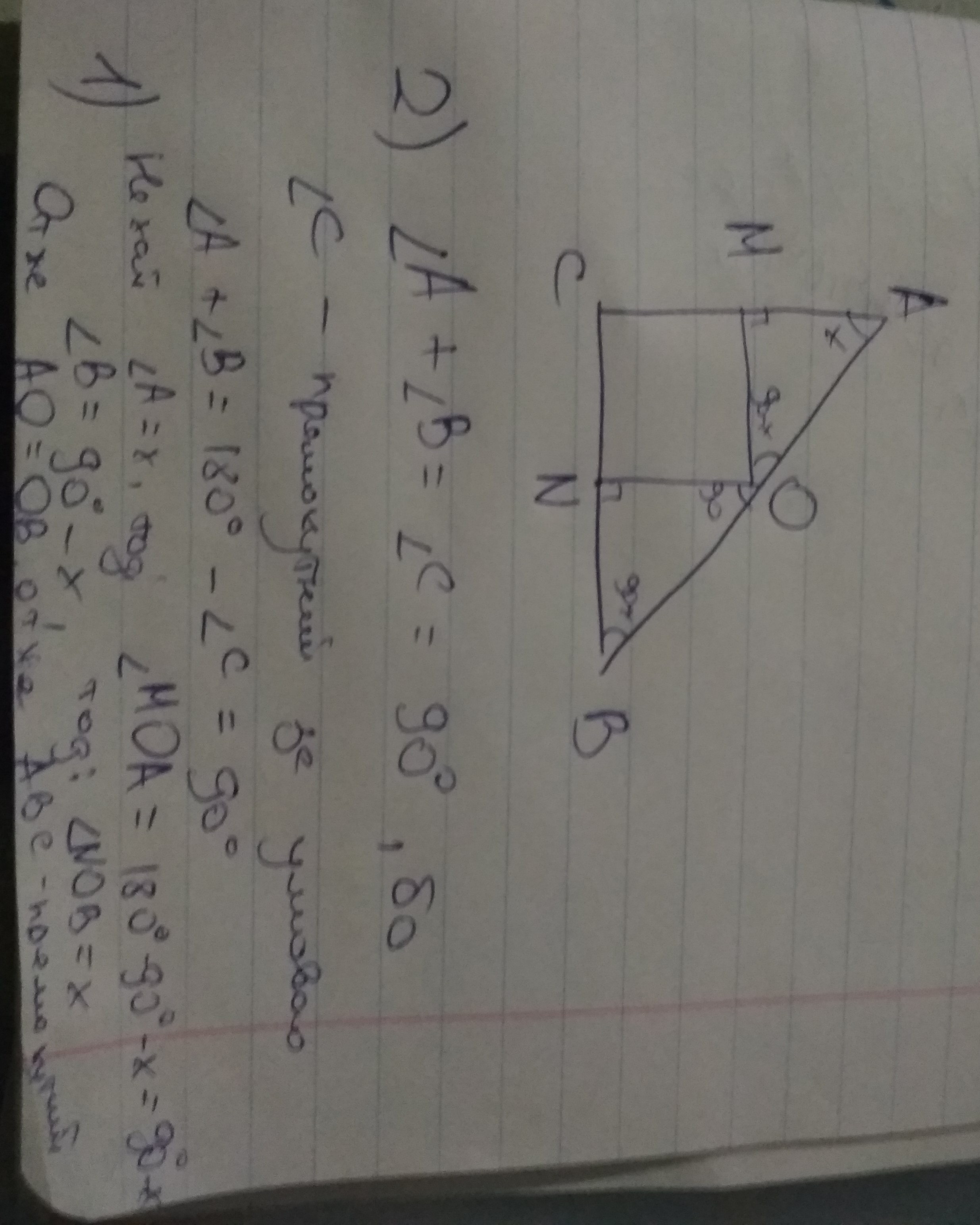 СЕРЕДИННЫЕ ПЕРПЕНДИКУЛЯРЫ К СТОРОНАМ AC И BC ТРЕУГОЛЬНИКА ABC ПЕРЕСЕКАЮТСЯ В ТОЧКЕ О, ЛЕЖАЩЕЙ НА СТОРОНЕ AB.