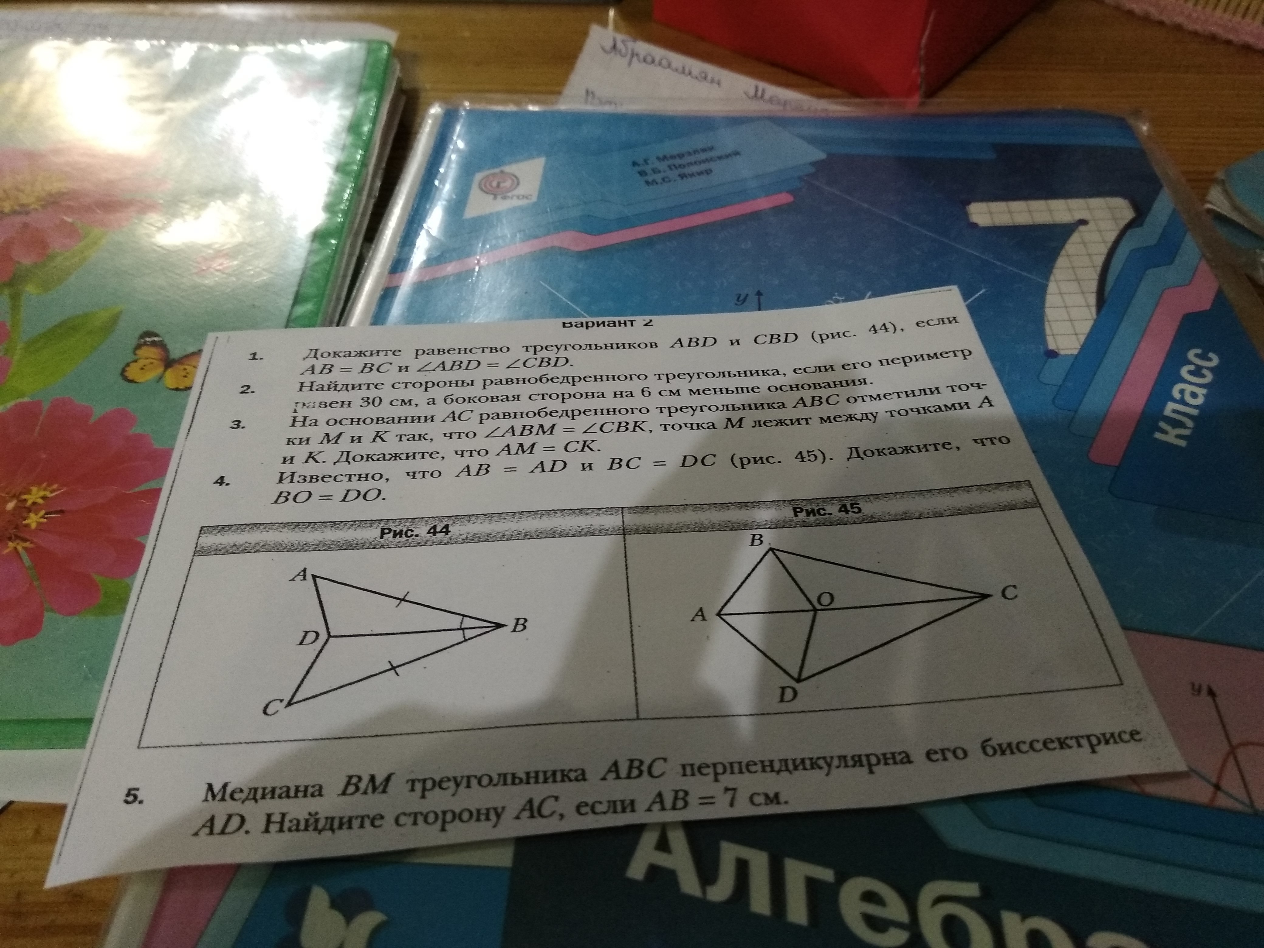 Докажите равенство треугольников ABD и CBD(рис 44), если AB=BC и угол ABD=угол CBD