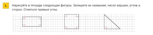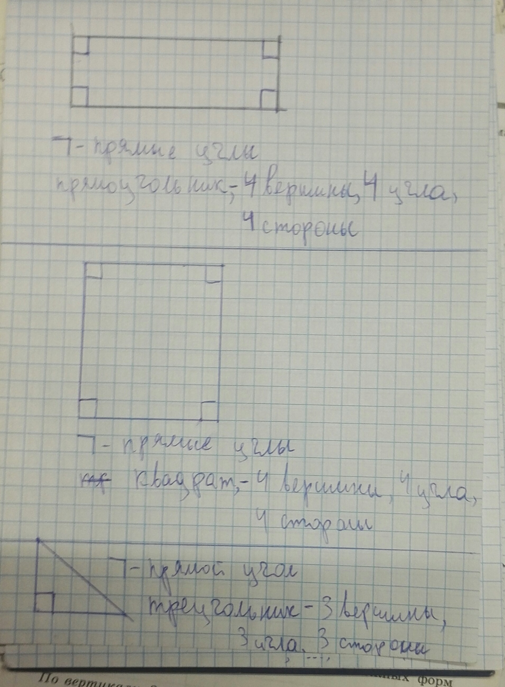 Нарисуйте в тетради следующие фигуры.запишите их названия,число вершин,углов и сторон.Отметьте прямые углы.