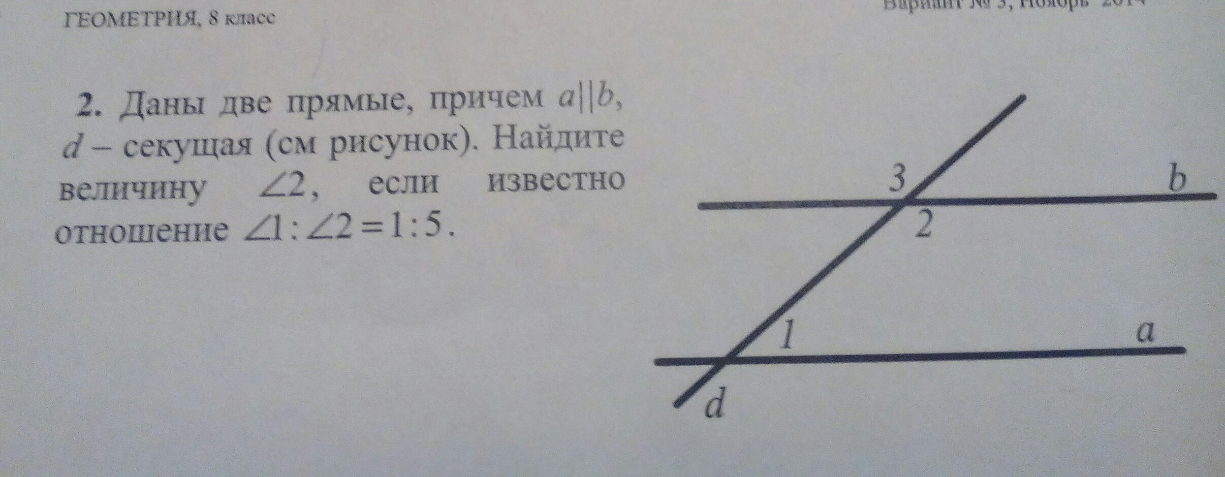 даны две прямые, причём а параллельна б, d- секущая. найдите величину угла 2, если известно отношение угла 1 : к углу 2= 1:5