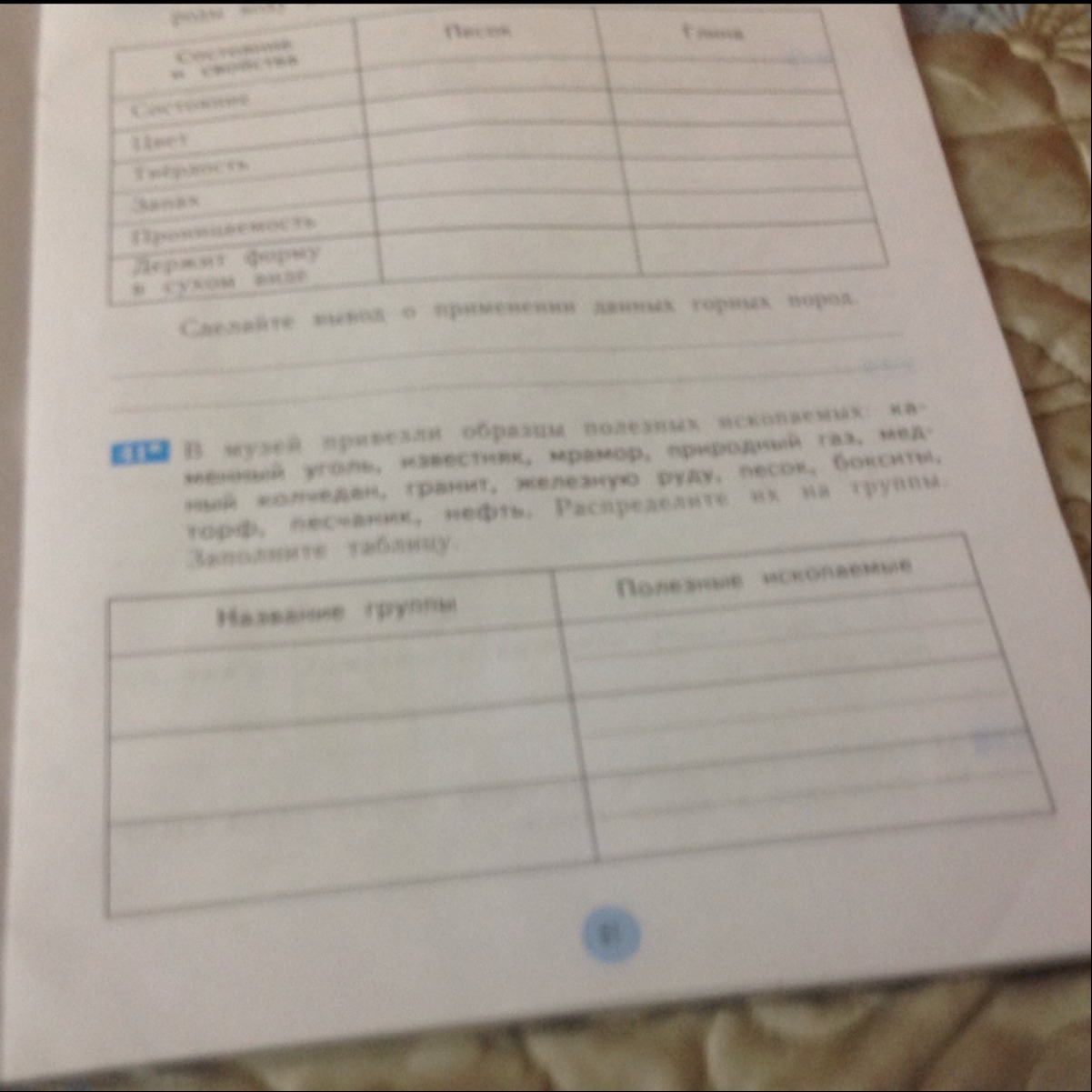 В музей привезли образцы полезных ископаемых : каменный уголь , известняк , мрамор , природный газ , медный колчедан , гранит , железную руду , песок , бокситы , торф , песчаник , нефть. Распределите их на группы. Заполните таблицу.